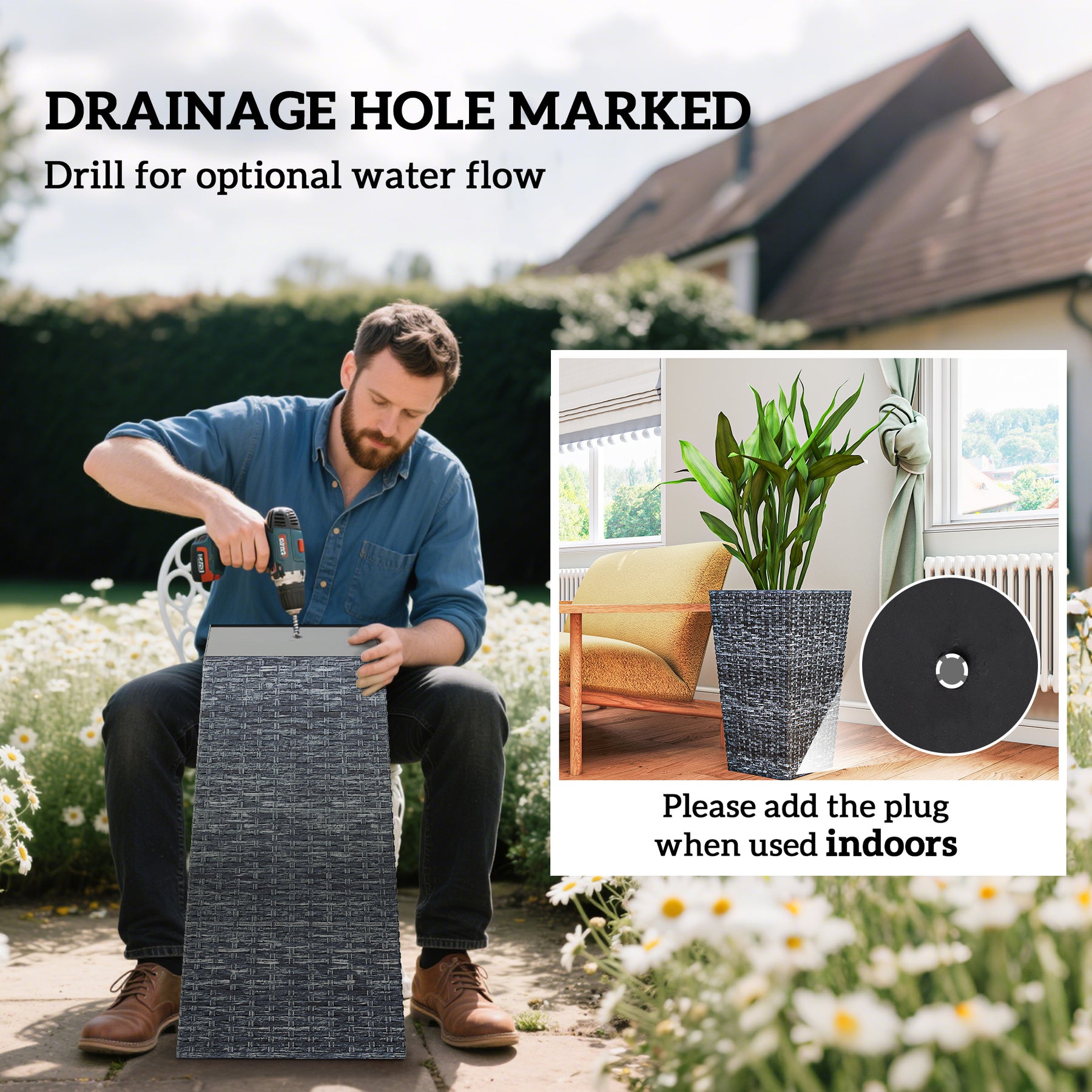 - • A drain hole with a plug at the bottom to prevent water from accumulating