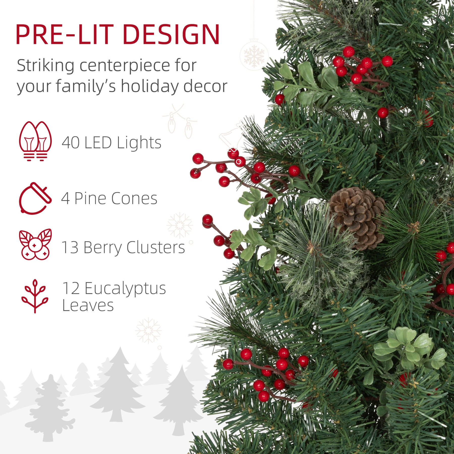 - • 2 types of tips, decorated with red berries, pine cones and Eucalyptus leaves
