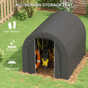 Offering a large amount of space with a level 5 windproof rating, the Outsunny tarp shed tent is a portable shelter to protect your motorcycle, garden tools, or other items outside. It has a thick PE tarp that can create a seal with the ground by burying its edges. The tarp holds on its frame with a ratchet tension system. Built with strong galvanized steel that mounts to the ground with stakes, our motorcycle shed provides outdoor protection at a moment's notice.