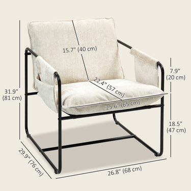 Elevate your space with the HOMCOM bedroom chair, which combines modern style and exceptional comfort. Wrapped in a luxurious chenille and supported by a sleek black steel frame, this reading chair complements any room. The washable covers and convenient magazine pockets on each armrest make this armchair a chic and practical addition to your living room or bedroom.