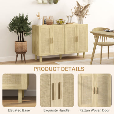 Are you looking for a valuable and elegant cabinet for your home? This HOMCOM buffet cabinet with storage features woven rattan wicker doors, adding a unique touch to any decor. Suitable for kitchens and dining rooms, it offers ample storage with three-level adjustable shelves. Crafted from particleboard with a melamine surface, it brings both elegance and practicality to your space.