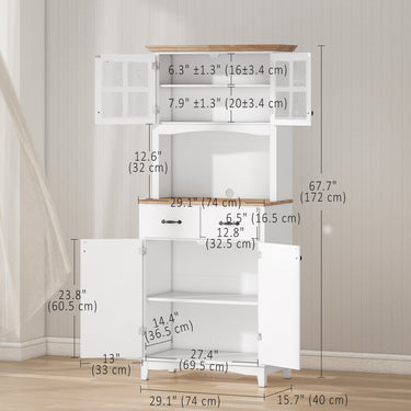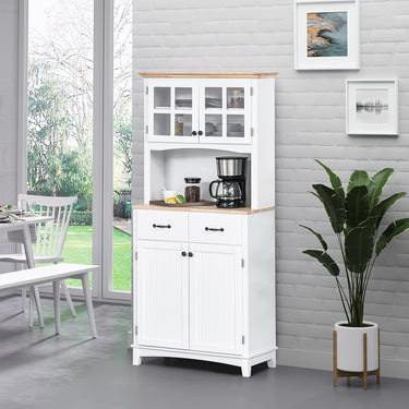 Organize your kitchenware and add more storage space with HOMCOM pantry cabinets with shelves and doors. You can use the upper framed glass door cabinet to store plates or display your collections. And the lower cabinet for bigger items such as coffee machine, toaster and wines. Middle drawers can be used to put forks, knives and napkins. And the rubber wood table top offers you a spacious area to place your microwave oven, coffee machine with cable management system.