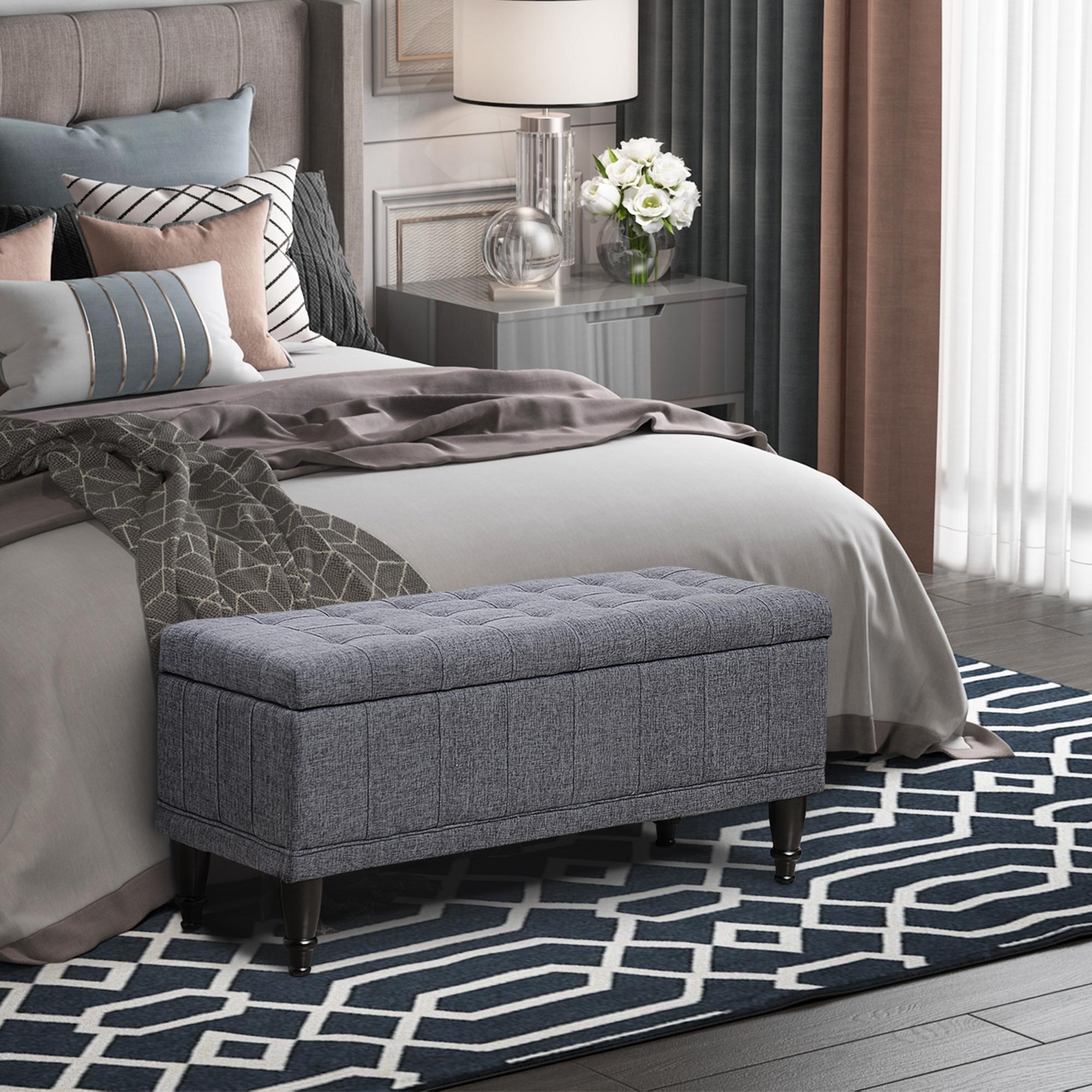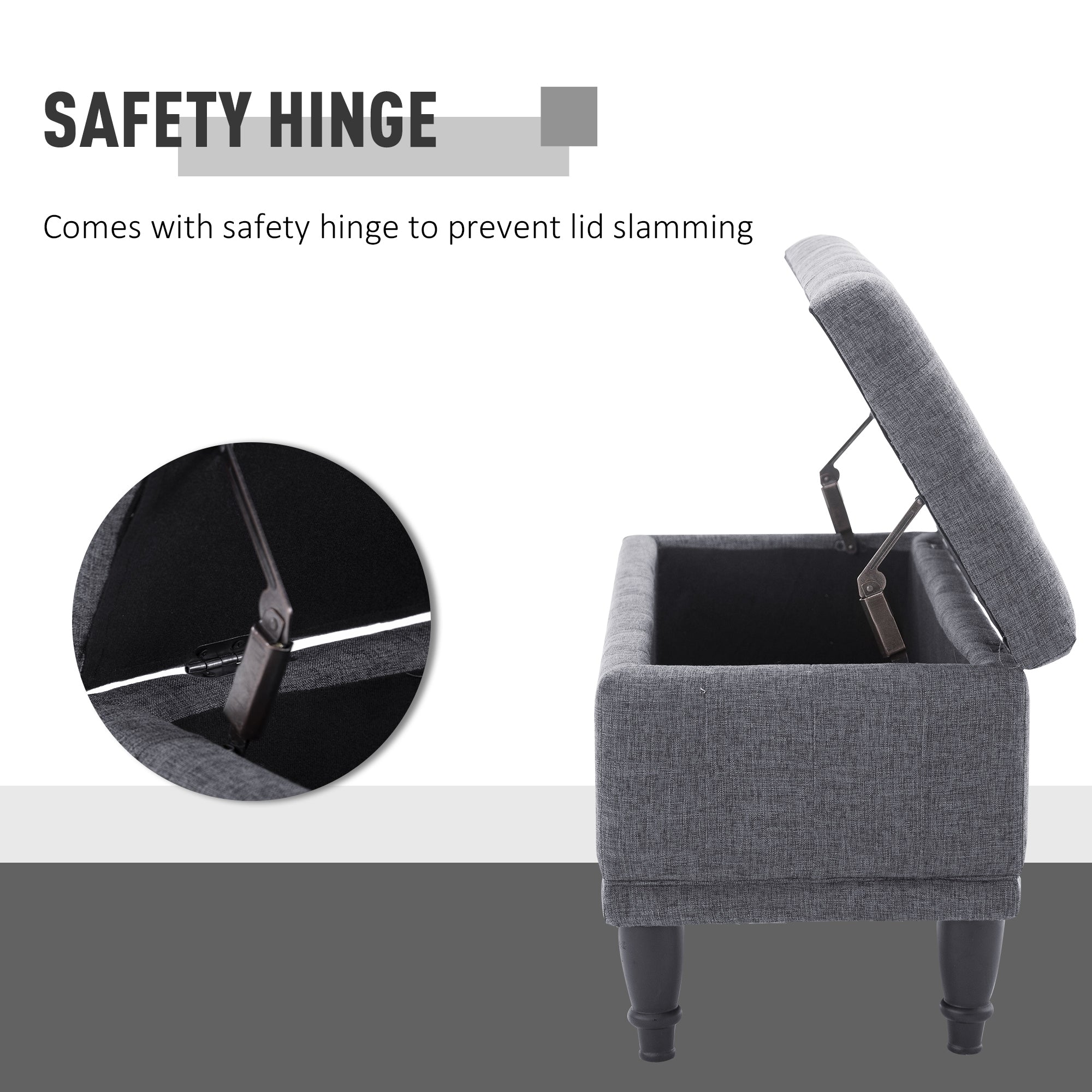 Finding the right style is necessary to help bring a room together and this stylish HOMCOM linen feel fabric storage ottoman bench is the great addition to any living room, bedroom, or entryway. It features a beautiful elegant exterior and tufted top, along with stable wooden legs and a roomy interior that is suitable for storing extra pillows and blankets, shoes, or other clothing and accessories. The storage chest with thickly padded, foam cushion top provides you with complete comfort.