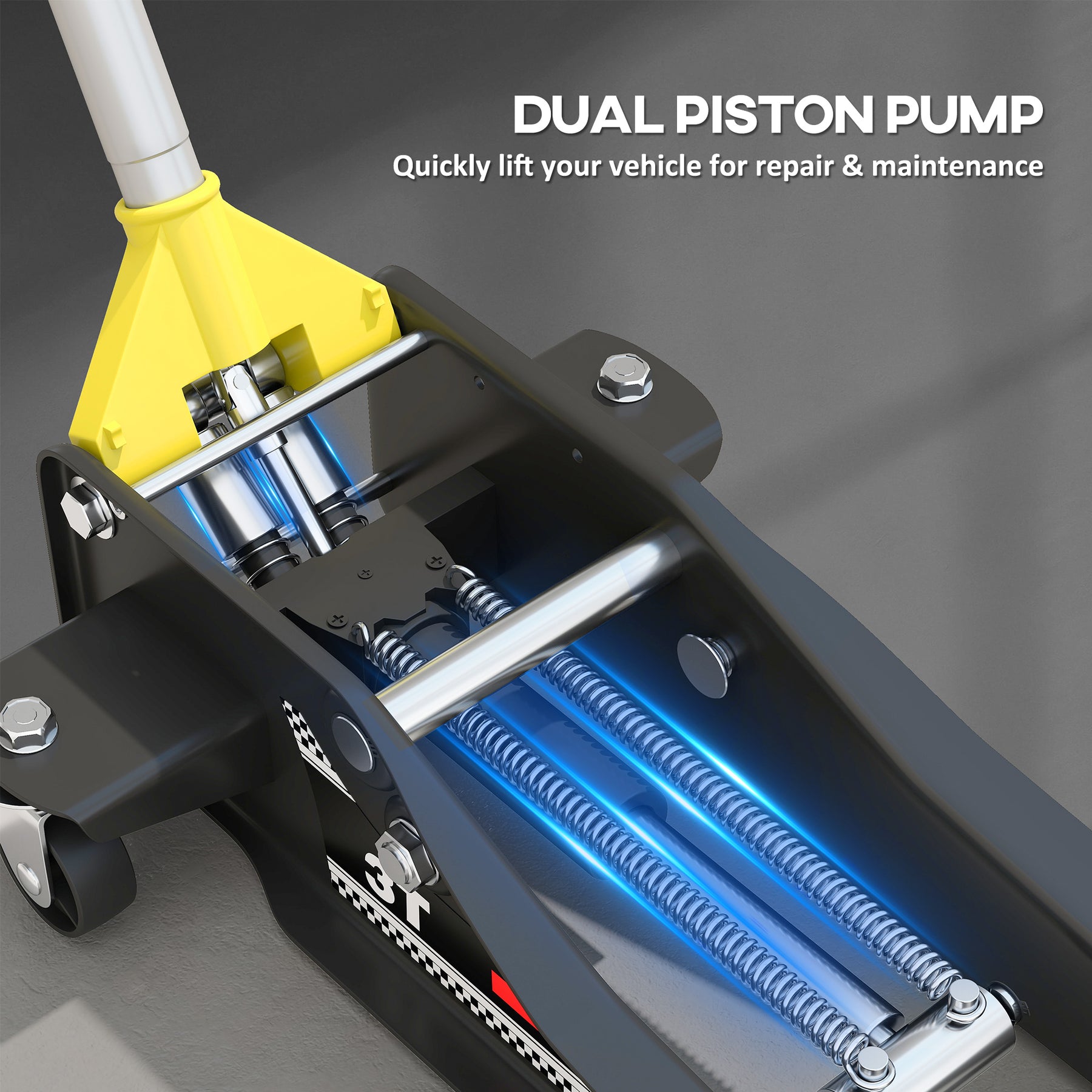 Take the hassle out of vehicle maintenance with the HOMCOM Hydraulic Car Jack. Designed for versatility and strength, this low-profile jack effortlessly lifts cars, trucks and motorcycles from 3" (7.5 cm) to 19.6" (50.5 cm). Built with a heavy-duty steel frame and a rust-resistant finish, it offers long-lasting durability. The dual piston pump hydraulic lift ensures fast, smooth lifting with less effort. Whether you're in the garage or on the go, HOMCOM delivers the power and reliability.