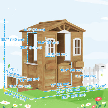 Kids will enjoy hours of play time with this wooden playhouse from Outsunny. Rest assured leaving your lovely child in this safe playhouse to play with their friends. Made of natural fir wood, it is robust for reliable use. With tilt roof design, water-resistant coating, built-in doors and windows for easy access and better ventilation, also keep your kids in good sight. Features a mailbox, flowerpot holders, fence, serving station, bench, bring your kid the most real playing experience.