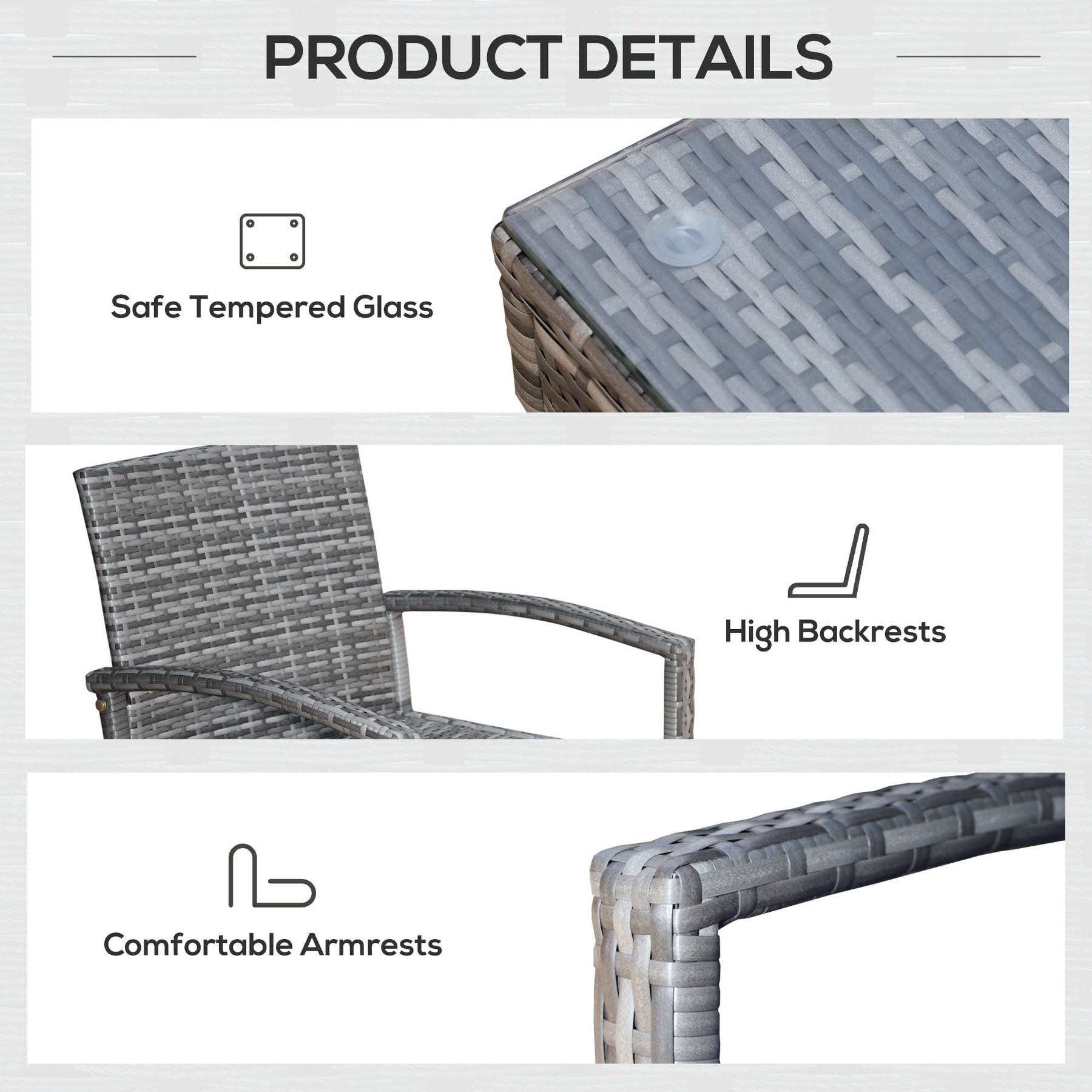 Our Outsunny outdoor balcony furniture is the best choice for both comfort and quality. Solid steel frame construction, high-quality PE rattan, and polyester cloth with exquisite workmanship ensure lasting durability. The table comes with tempered glass for solid beverage placement, and the thickly padded cushions offer optimal comfort. The Outsunny 3-Piece Rattan Chair and Table Set is essential for any backyard or patio setting to complete the look in comfort and style.