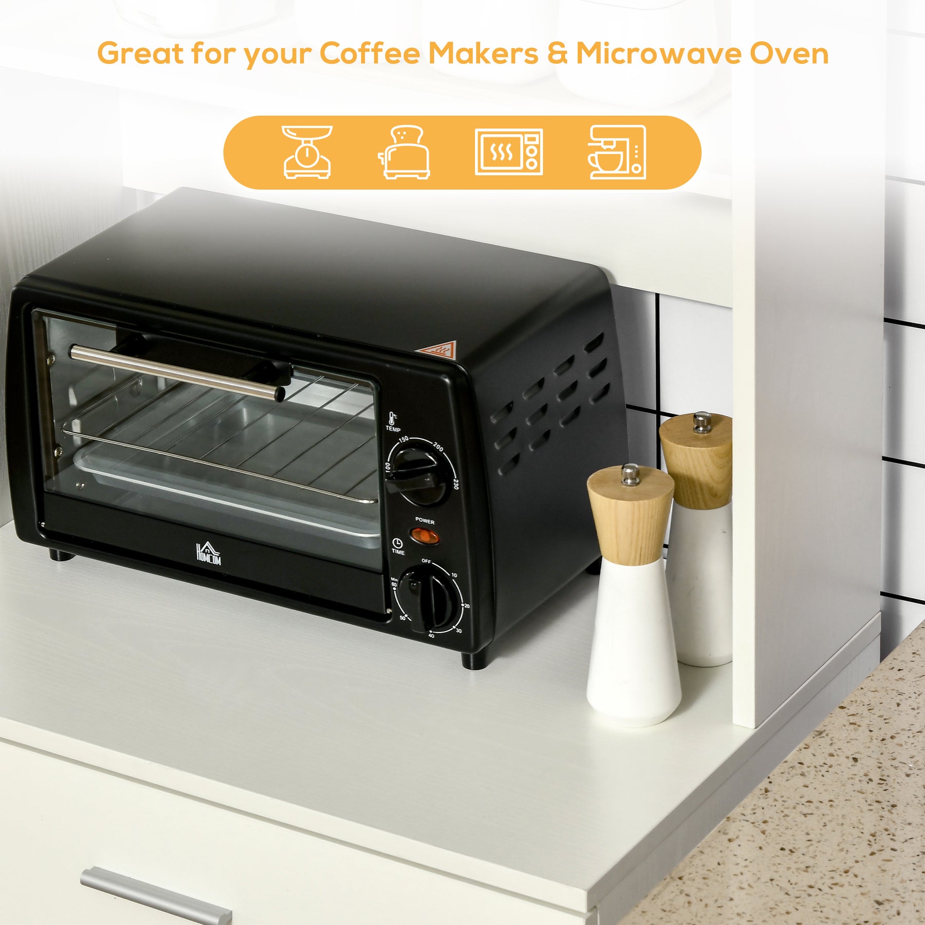Add much-need spare storage to your kitchen for all your spare kitchenware, utensils and glassware. It features an open shelf and a counter where you can keep a microwave or even add a coffee machine to create your very own home bar. Up top, there is a 2-tier door cabinet and the base of this storage unit has a drawer and cabinet with an interior shelf for out-of-sight storage. Crafted from manufactured wood, this pantry cabinet with shelves and doors is perfect for your home of any style.