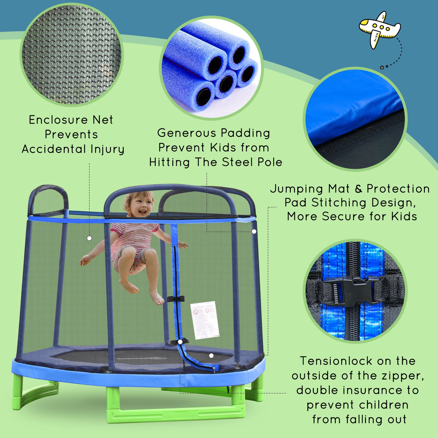 - • Zipper allows easy entering of the trampoline