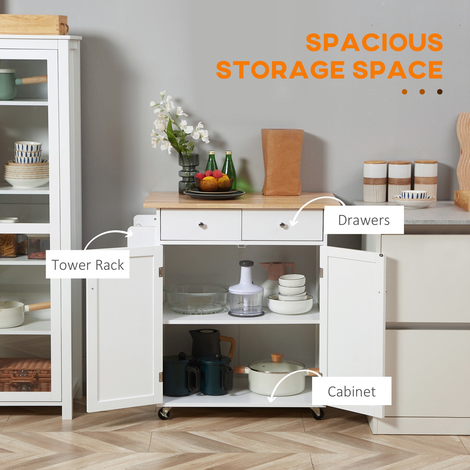 This prep & serving cart well fits limited spaces and can be moved to wherever you need it. 2 pull-out drawers, a double-door cabinet and a towel rack provide ample space for supplies and accessories. Easy-roll wheels allow you to move wherever it is needed most. Solid rubberwood tabletop and MDF panels ensure sturdy construction and easy cleaning.