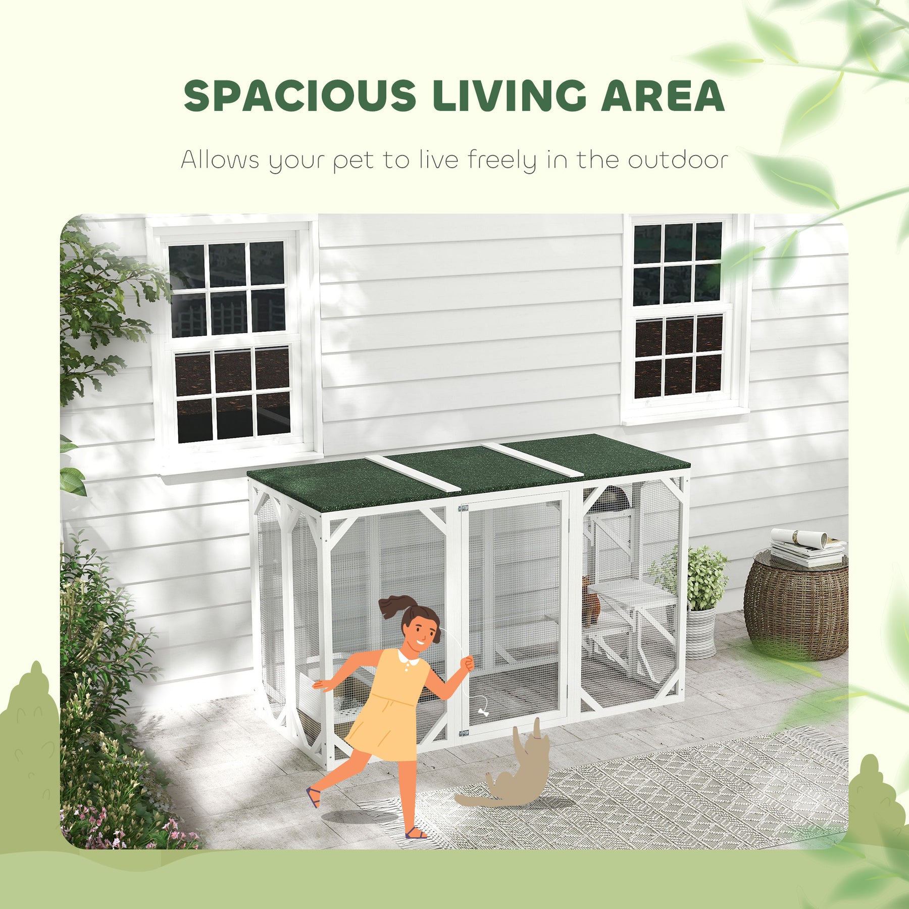 Are you tired of looking for a safe and comfortable play area for your adorable pet? Then stop looking! The PawHut pet cage is an ideal home and natural habitat for more cats or other small animals. The metal wireframe, spray paint, and fir wood framework structure provide a safe and protected environment. The asphalt-felt crate cover is water-resistant and sun-resistant, providing your little furry friends with all-weather protection!