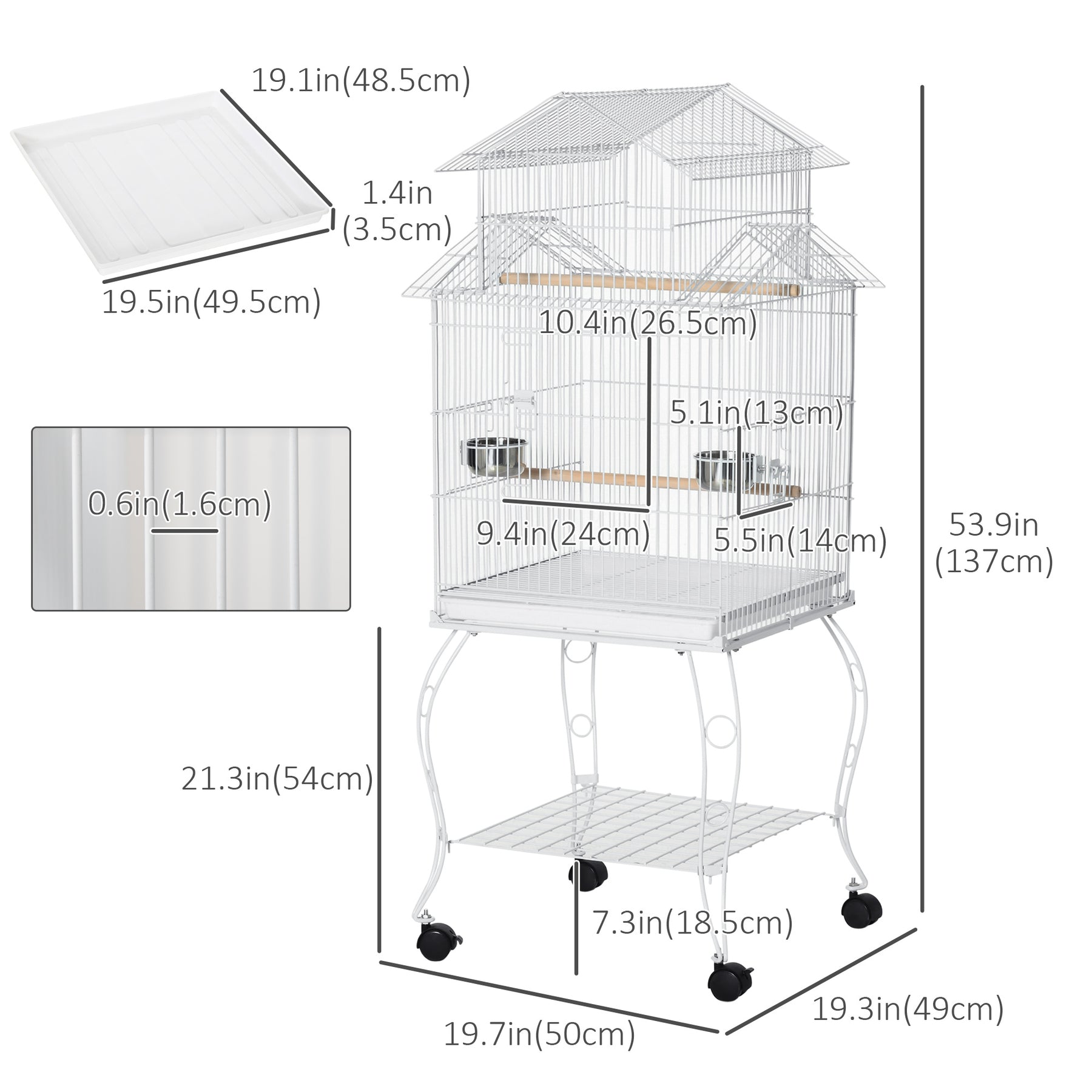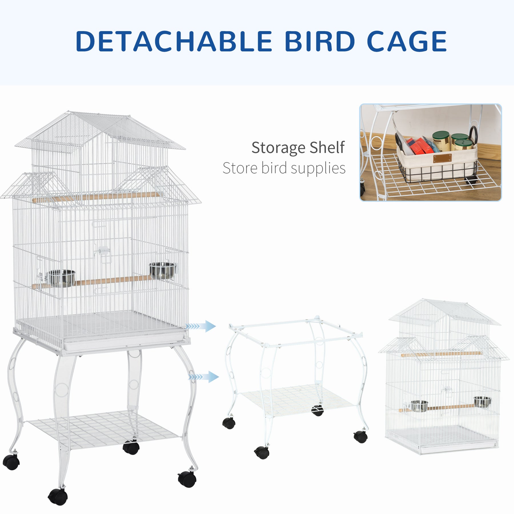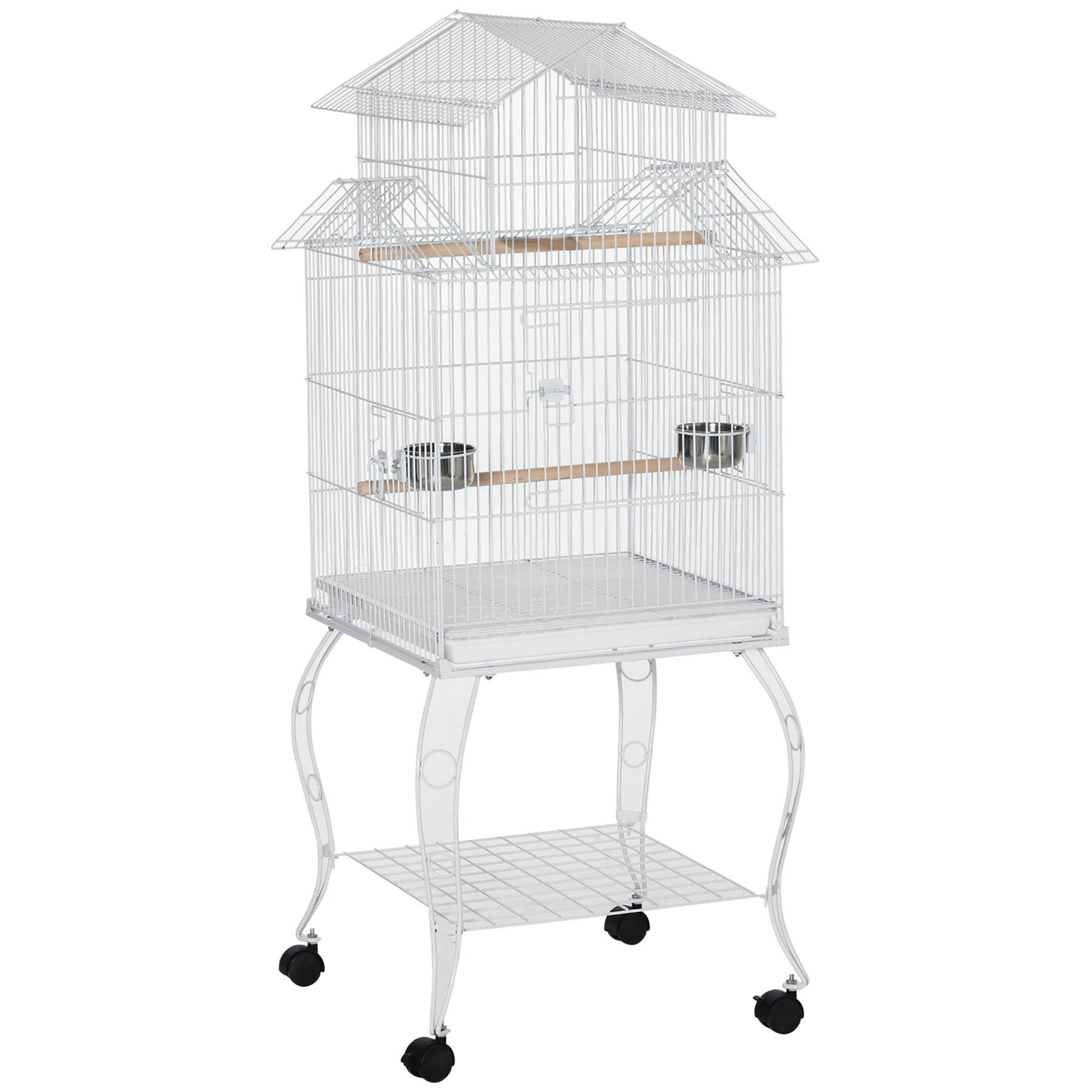Keep your pet stimulated and safe with an indoor bird cage starter kit with a rolling stand from PawHut. This large parrot cage with wheels includes wood perches and two food containers for your birds to enjoy. Store any bird supplies on the convenient storage shelf. Keep them safe and secure and keep them happy, active, and occupied for an extended time. The slide-out tray on the bottom is designed to catch bird seed and slides out to make clean-up a breeze.