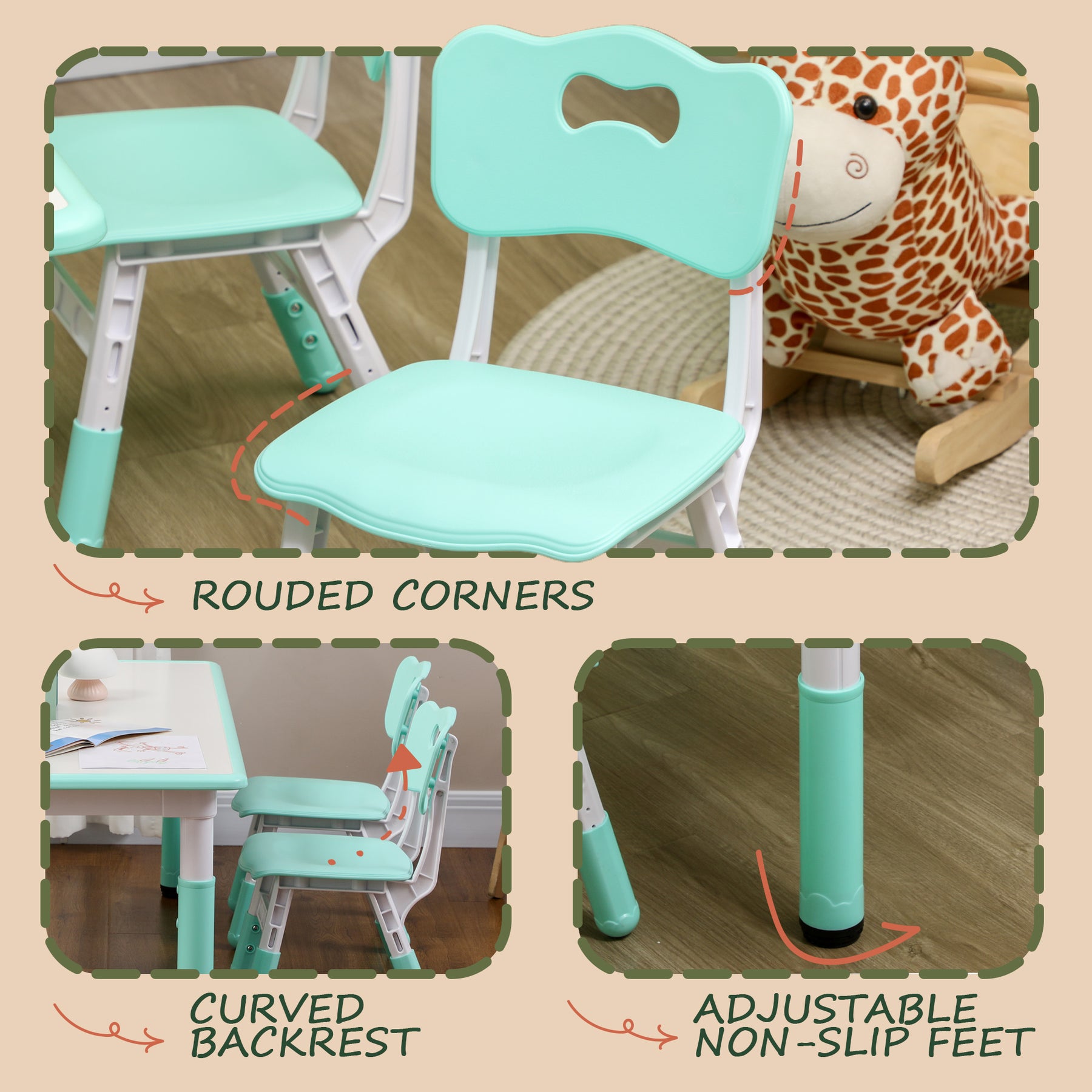 Welcome to the world of fun and creativity with the kids table and chairs set from Qaba! Designed for your child's enjoyment, this set includes a table and four chairs, great for play dates, homework sessions, and meals with friends. The adjustable height means that this set grows with your child, suiting their needs as they age. Your kids will feel like grown-ups with this feature, boosting their confidence and independence. The easy-to-clean surfaces allow for a hassle-free clean-up time.