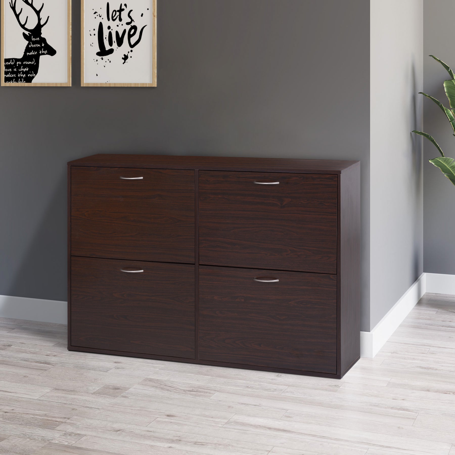 Do you want a practical and fashionable way to organize your shoe collection? Consider the HOMCOM shoe cabinet for your entryway. Its dark, neutral colour finish blends seamlessly with any home decor. Its four tilting, pull-down drawers offer ample storage and display space for up to 24 pairs of shoes (depending on size and type). Whether you're looking to tidy up your entryway or porch area, this storage cabinet with doors is an ideal addition to your living space.