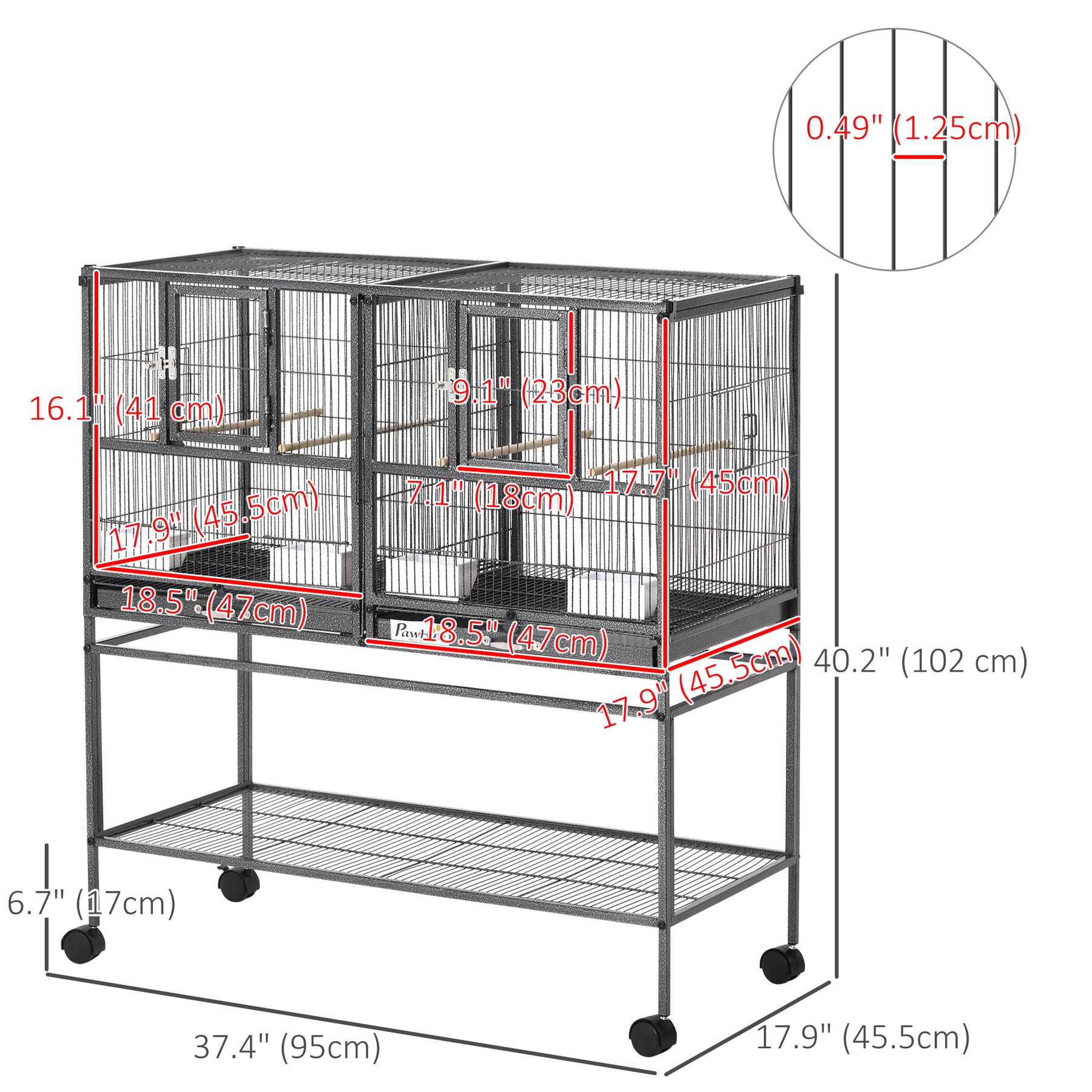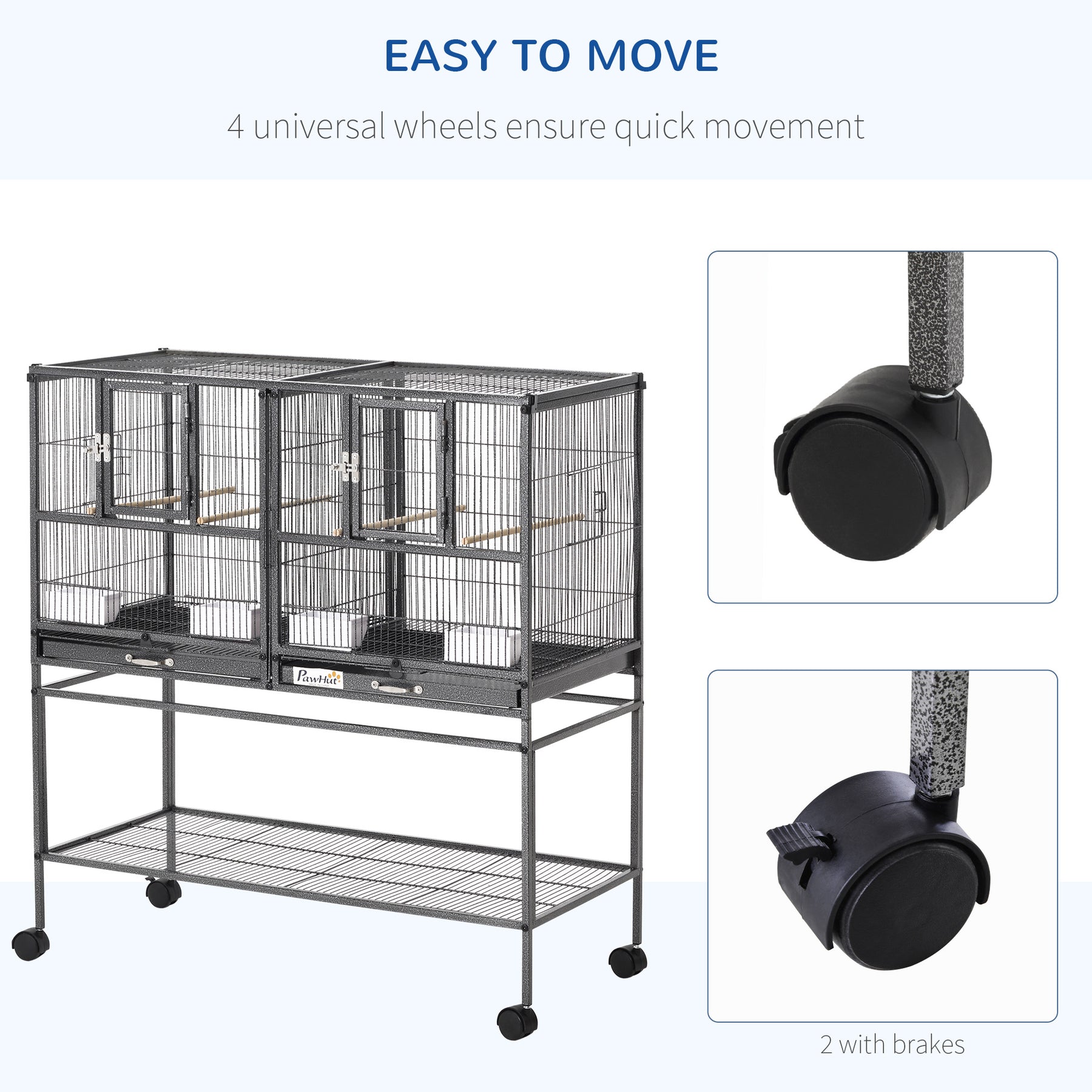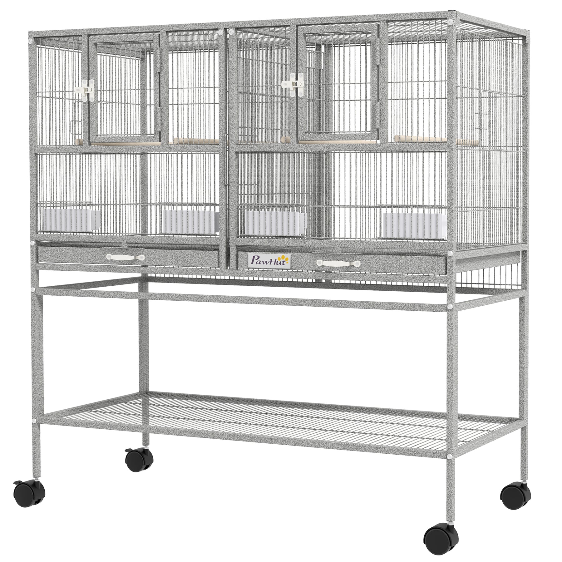 Keep your pet stimulated, safe, and happy with an indoor bird cage starter kit with a rolling stand from PawHut. Our cage provides plenty of living space and room for activity. Equips 4 wood perches and 4 plastic food containers for your birds to enjoy. Keep them safe, keep them secure, but also keep them happy, active, and occupied for a long life worth living. The 2 slide-out metal trays on the bottom are designed to catch birdseed and slide out to make clean-up a breeze.