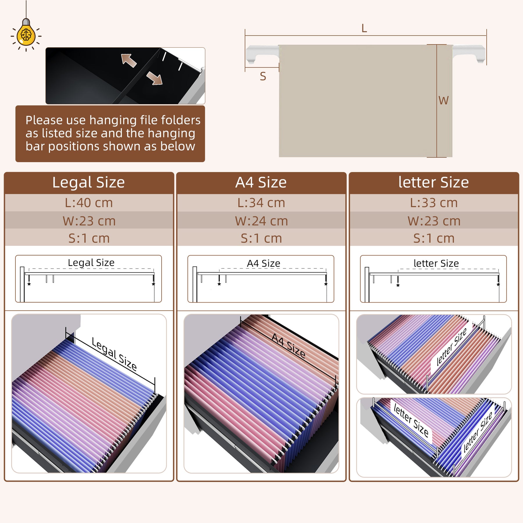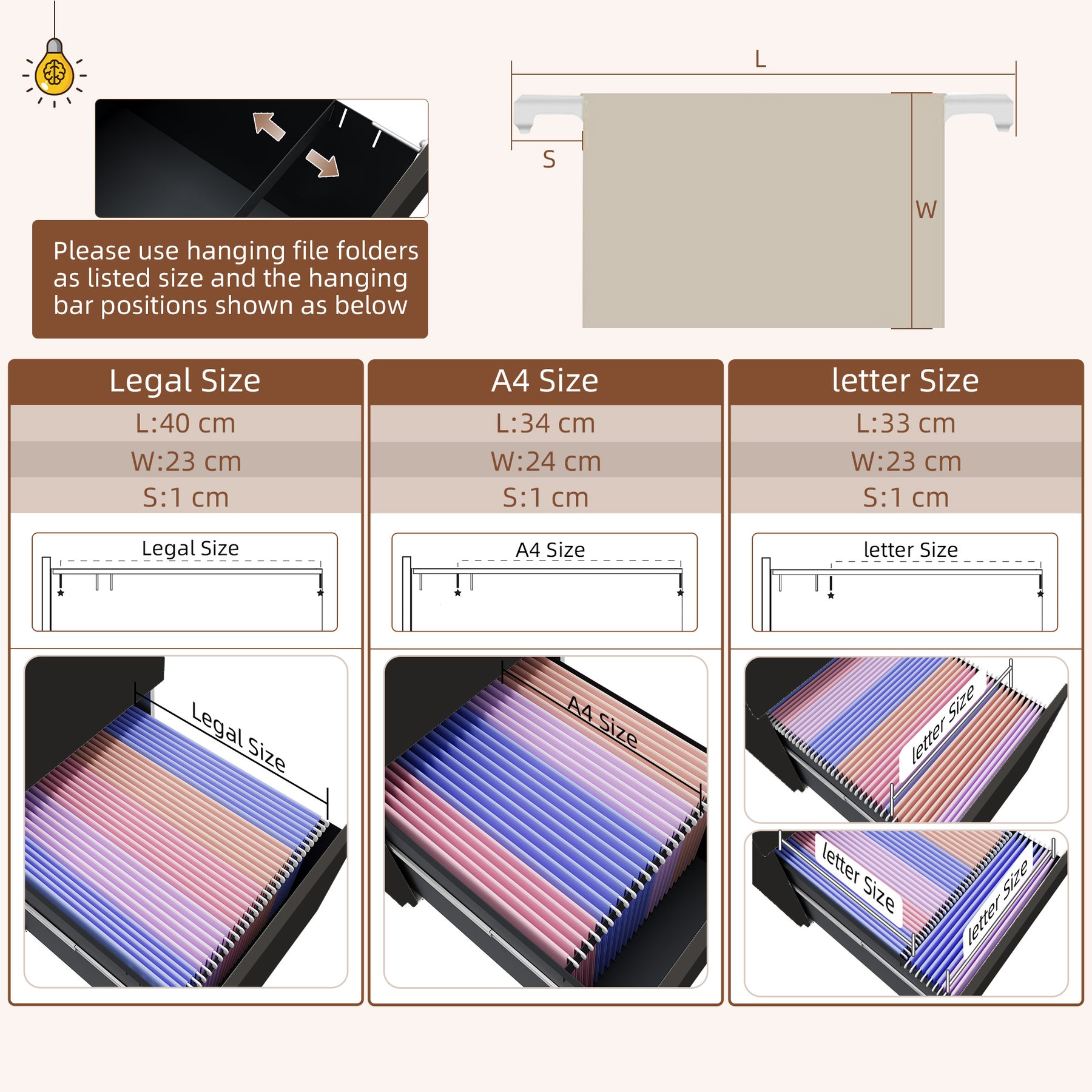 - • Adjustable hanging bar to hold letter, A4 and legal sized files