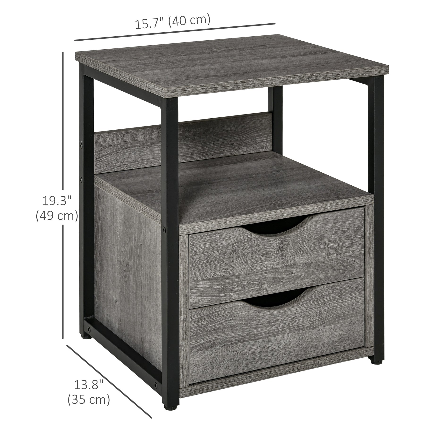Upgrade your living space with HOMCOM's small table. This elegant and practical storage cabinet features a spacious tabletop, an open shelf, and two drawers - ideal for all your essentials. Its industrial-style wood grain panel and sleek black metal frame will impress in any room. Order yours today and take your interior design to the next level!