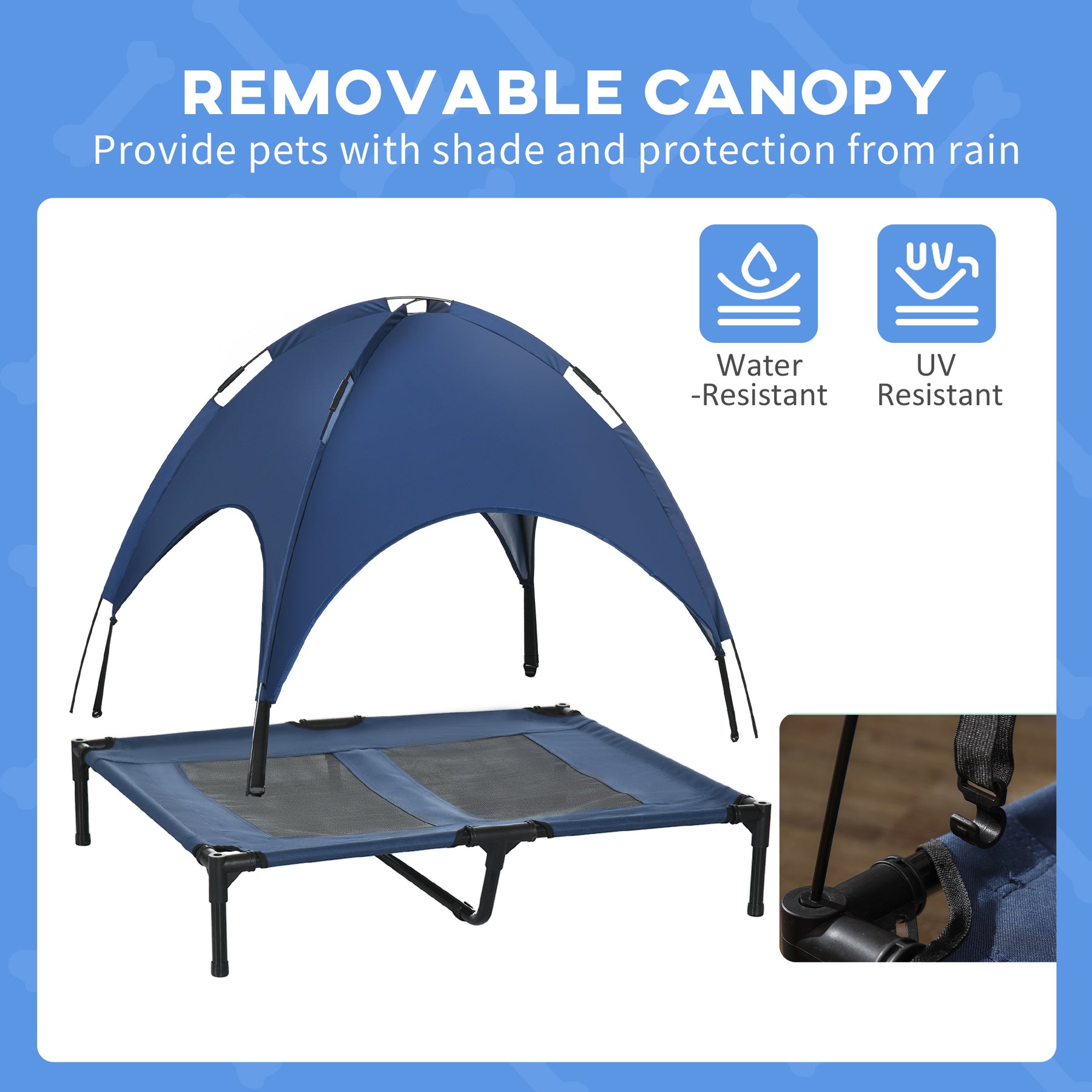 Treat your pet to the ultimate in relaxation with an elevated pet bed from PawHut. This dog bed not only keeps your dog comfortable and off the ground, but also promotes airflow to keep them cool. Included canopy top shields them from the sun on hot summer days. Simple design, just plug the canopy into the corners of the cot and secure it with the bungee cords. The lightweight yet strong powder-coated steel frame with four stable feet that ensure safe and level placement that won’t tip over.