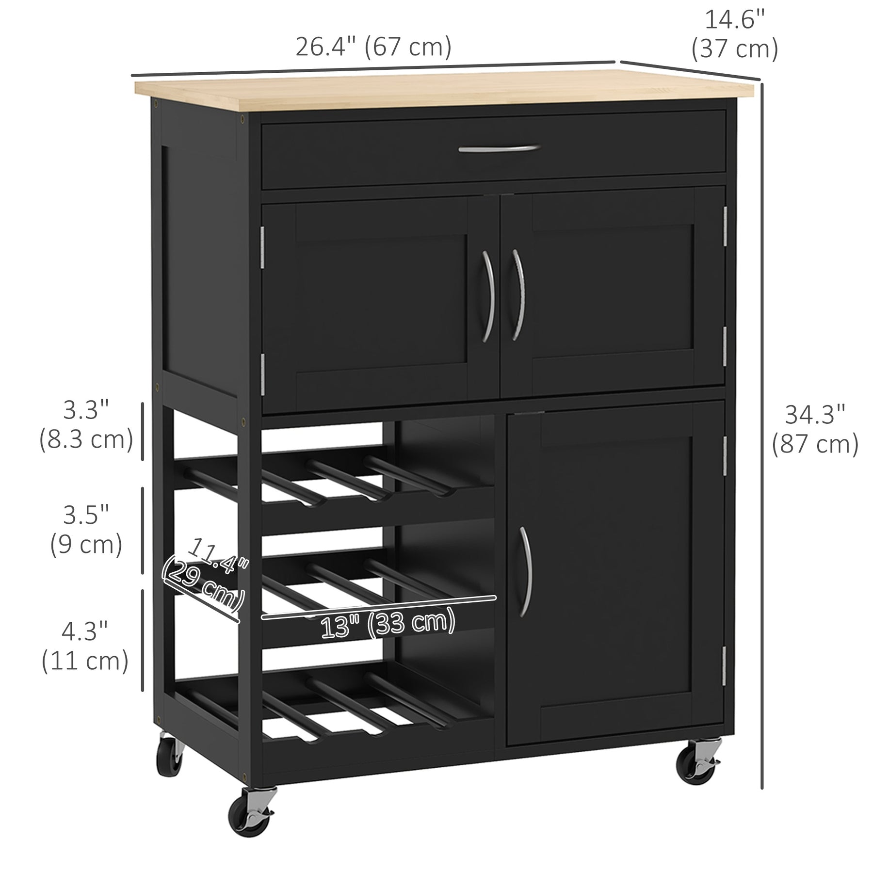 This rolling kitchen island is an ideal option for any kitchen and dining space - no matter the size. Comes with a drawer, 9-bottle wine racks and two cupboards provide plenty of room for holding everything together. Wheels allow you to move it where you desire. The rubberwood countertop is hard and ideal for prepping drinks garnishes when friends come over. Upgrade your kitchen today with HOMCOM coffee cart.