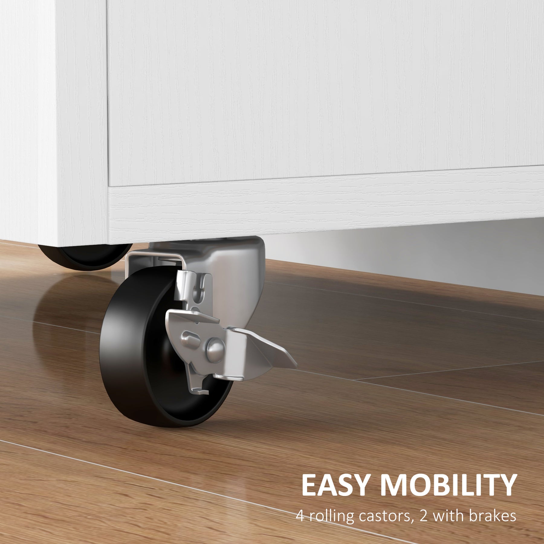 - • 4 rolling wheels (2 with brakes) make it easy to transport and also keep steady in place