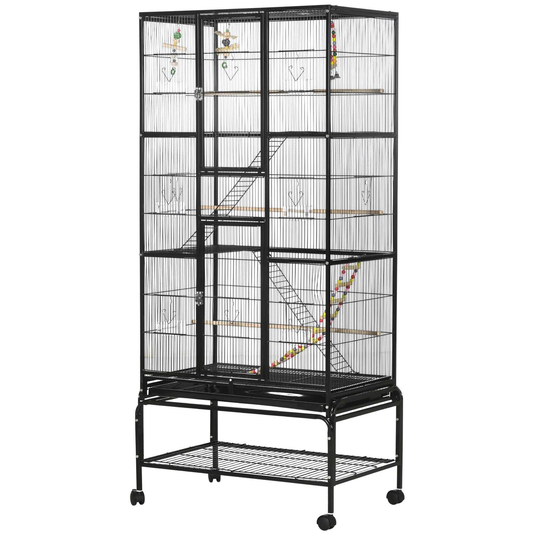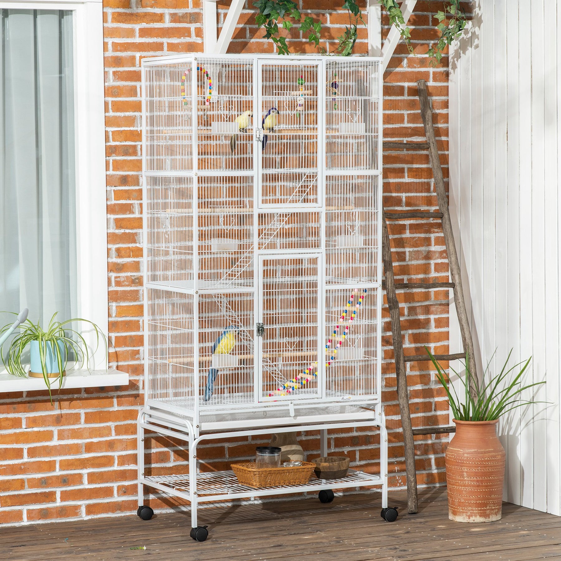 Need a spacious spot where birds can feel secure? This PawHut parrot cage is the solution. Plenty of space to spread their wings, they'll have a choice of perches to rest on. Lots of bird toys, platforms and ladders build a playground for your friend. Containers for food and water, whilst the multiple doors make it simple to access the cage. Slide-out tray for quick cleaning, keeping their space tidy. A stand underneath with four wheels for easy movement and two have brakes for security.