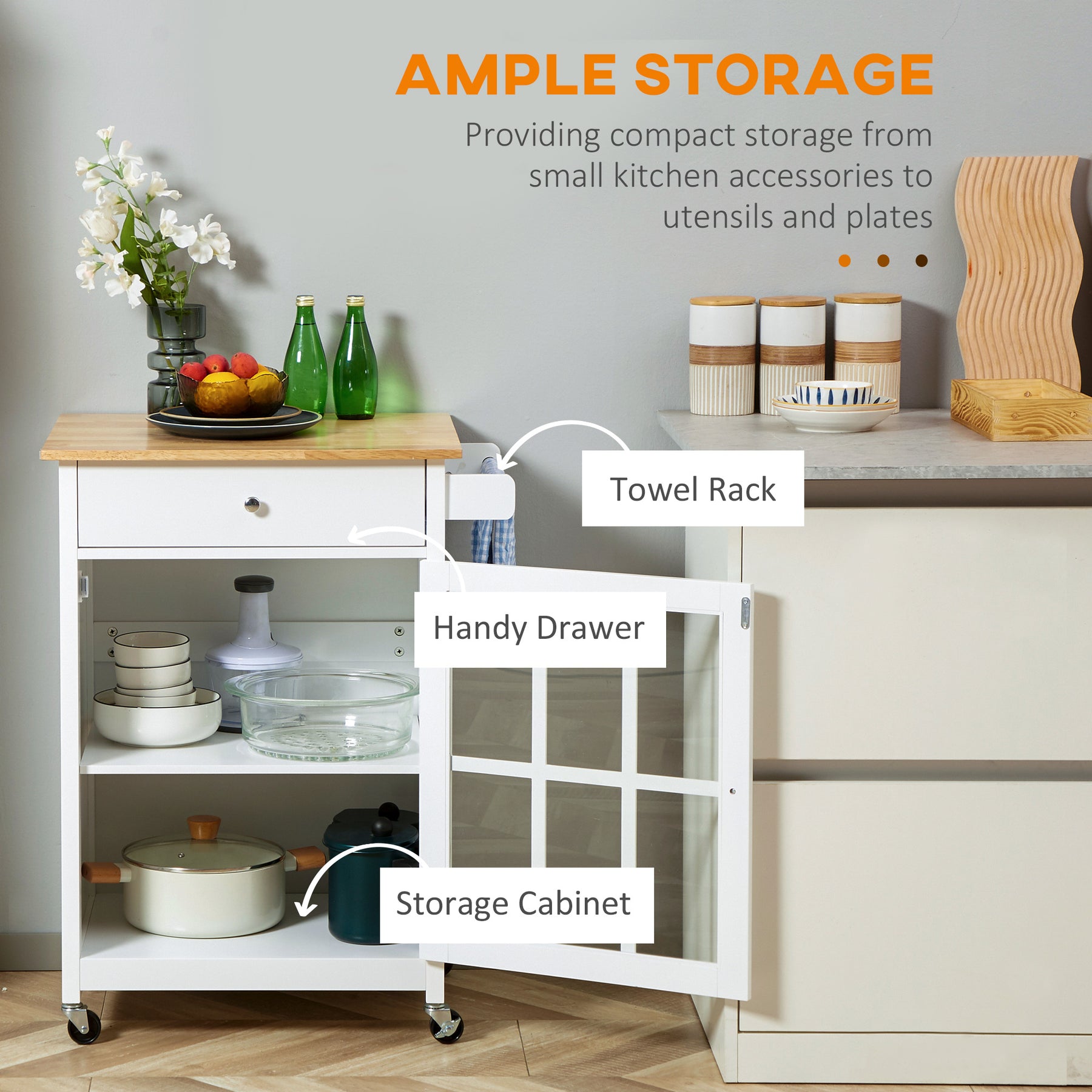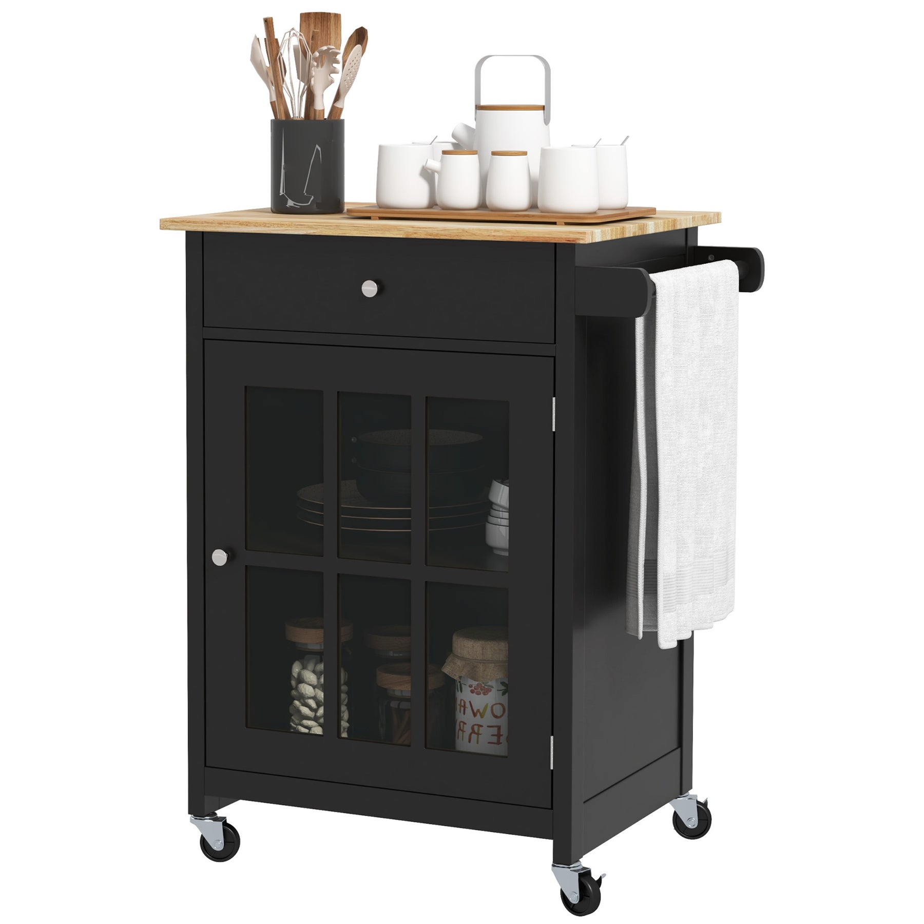 Need an extra storage space but more room for an entire kitchen island? Our kitchen island with storage from HOMCOM offers everything you need in kitchen furniture. This kitchen island cart has a drawer and a glass door cabinet, providing storage for your kitchen essentials and dry goods. The towel rack can also be used as a handle to move it around the room. 4 wheels have 2 brakes equipped, so it stays in place while using this kitchen cart. Upgrade your kitchen with HOMCOM.