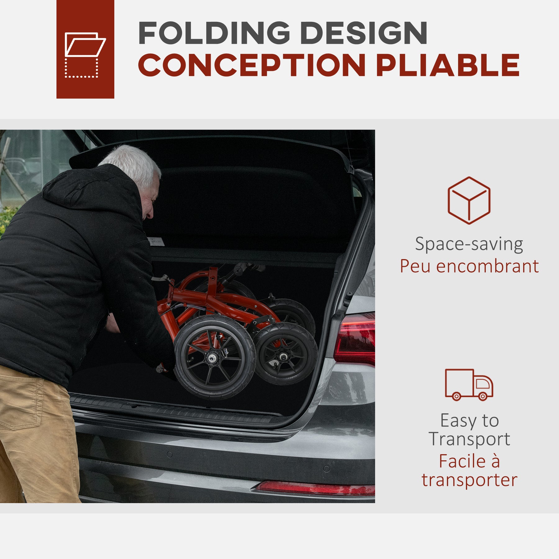 - • Inflatable rubber tires are well-suited for various terrains, with dual brake for safety stop