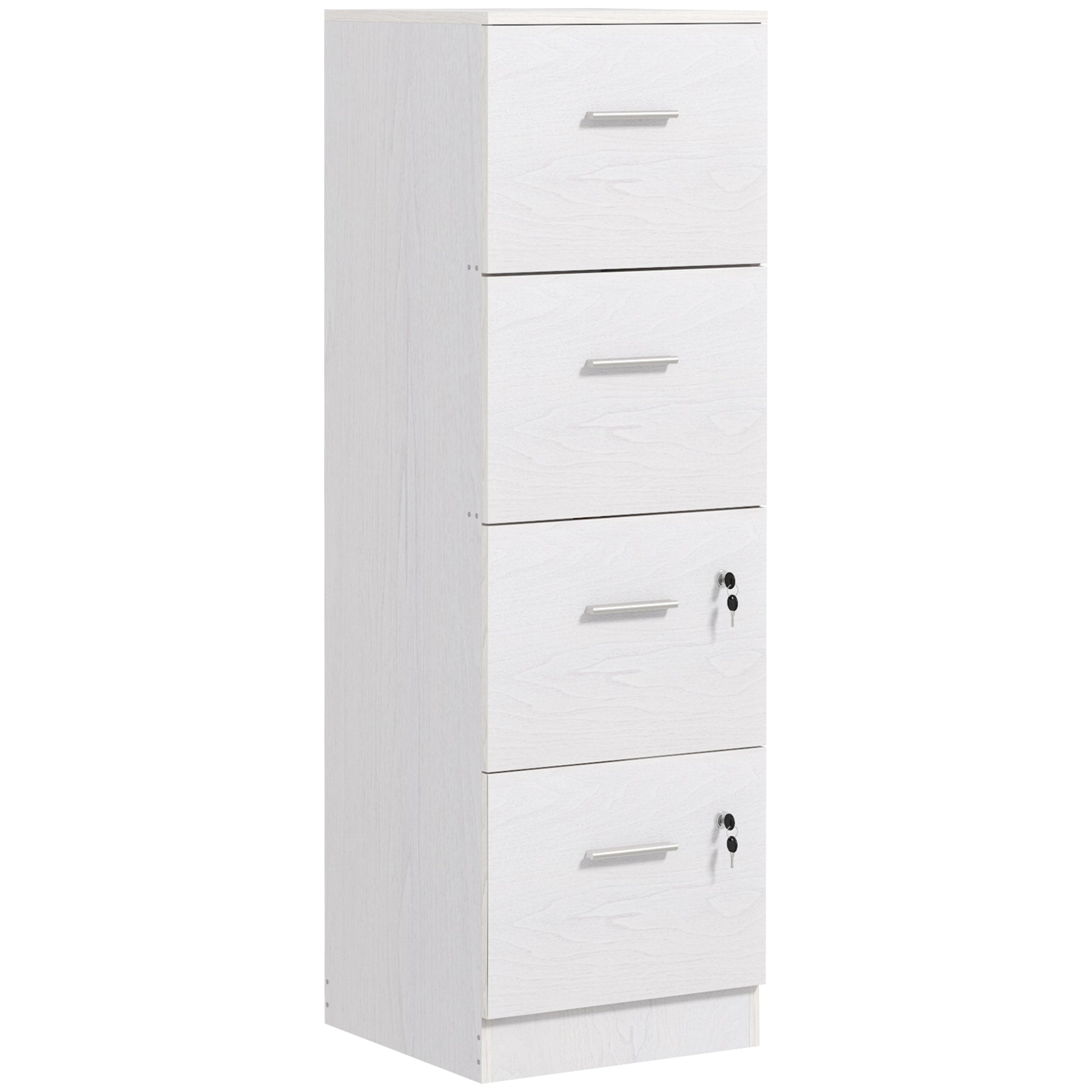 Keep your documents organized and secure with the lockable filing cabinet from HOMCOM, featuring four drawers complete with 2-level adjustable hanging bars for A4 and letter-sized files. The melamine-coated particleboard offers a clean, wood grain look that doubles as a chic printer stand or home office cabinet, while the anti-tipping design and foot pads ensure your working space stays stylish and safe.