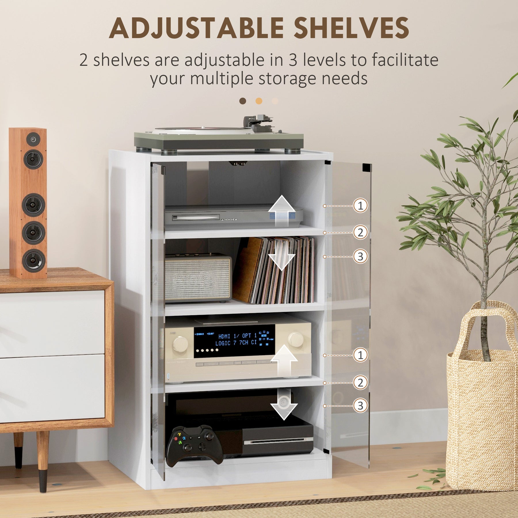 - • The upper and lower shelf inside is 3 levels adjustable to meet your different storage needs
