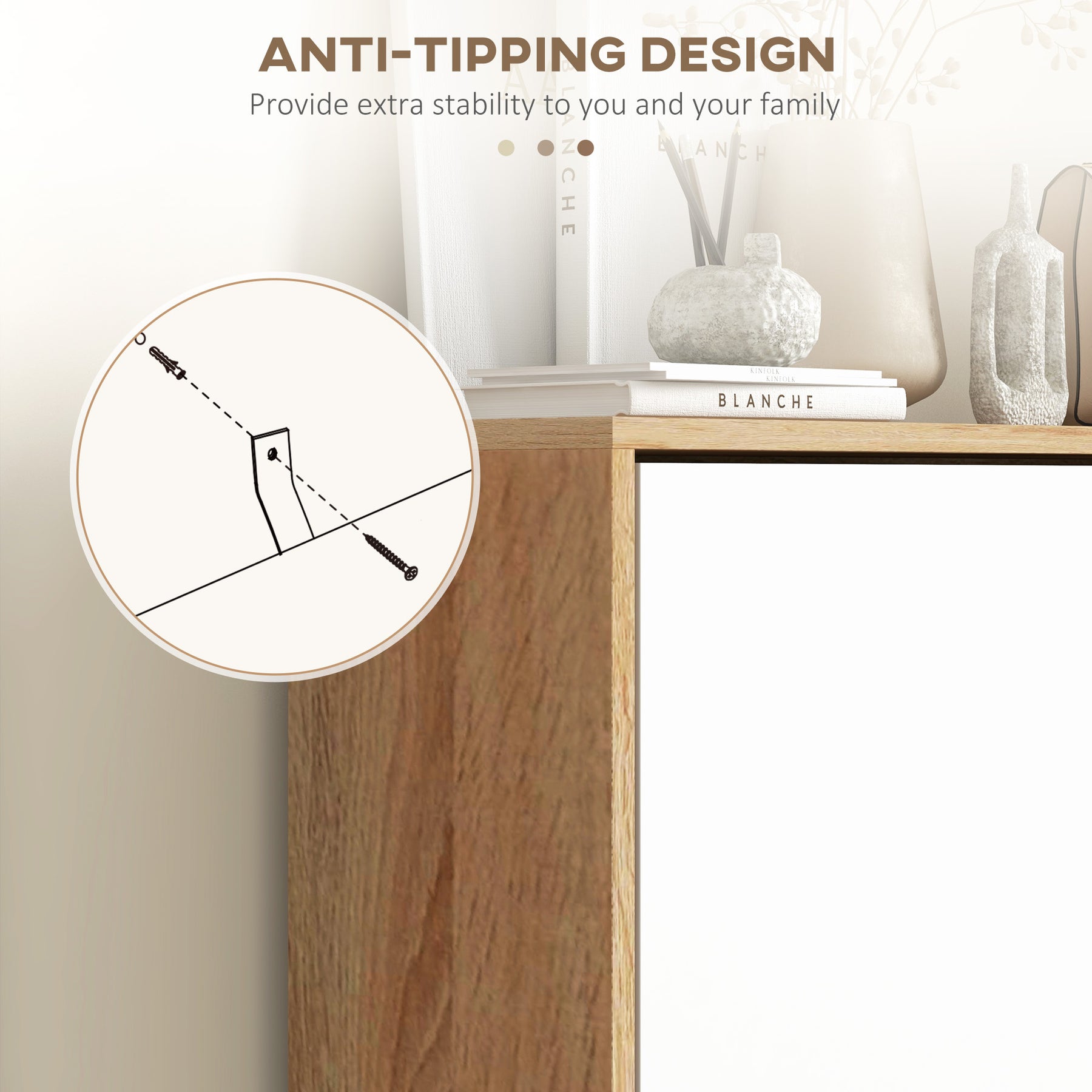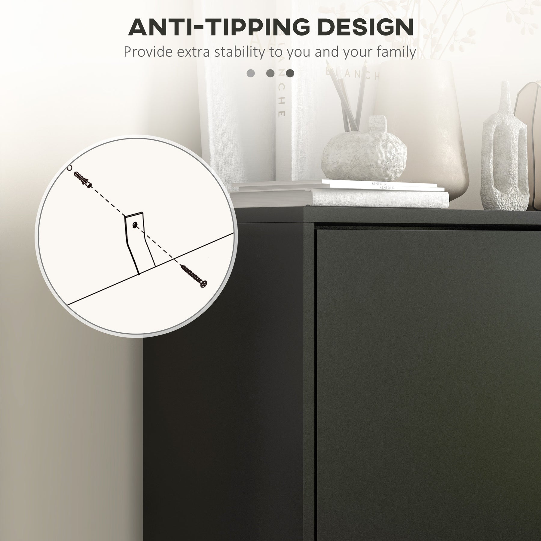 - • Anti-tipping straps ensure safety by securing cabinet to wall