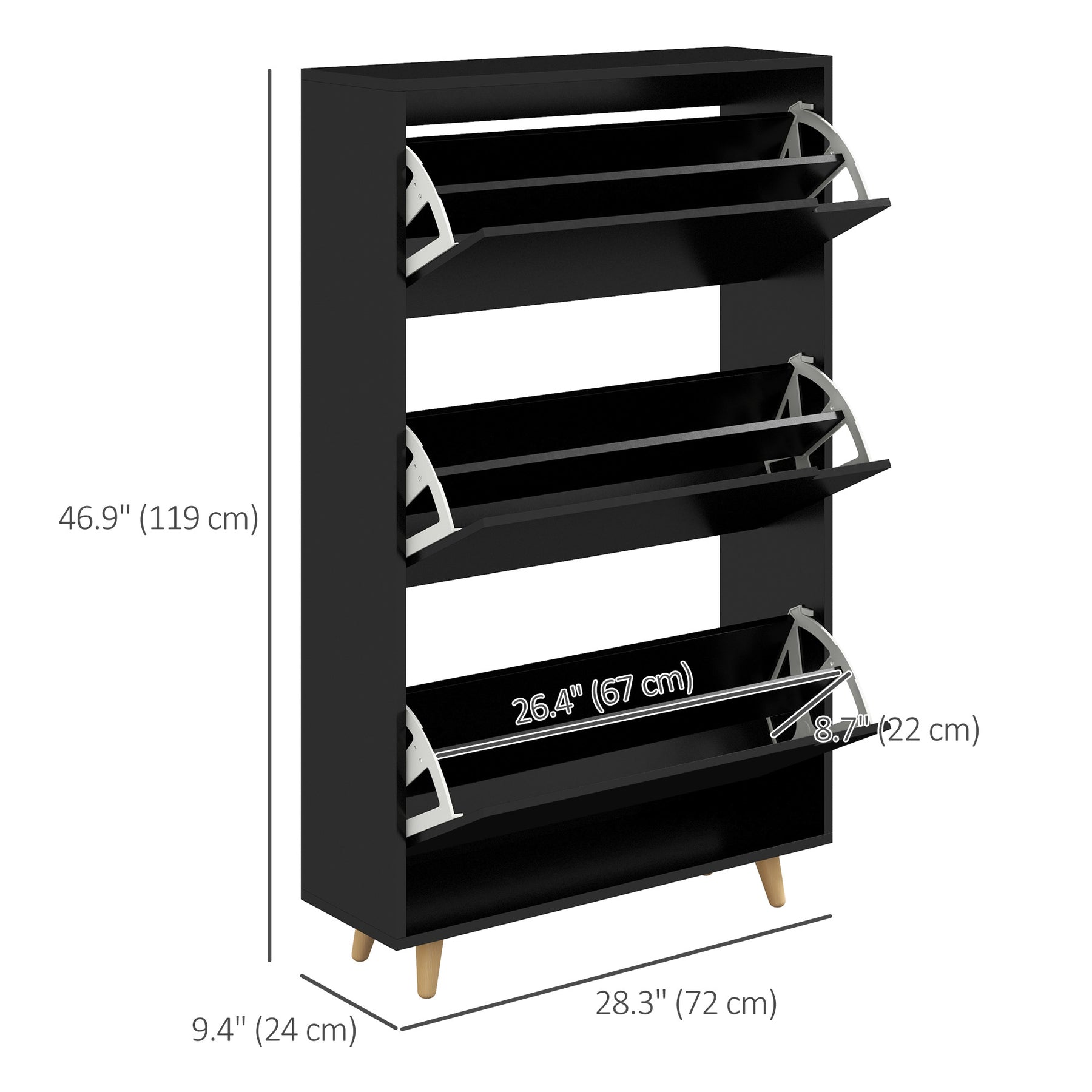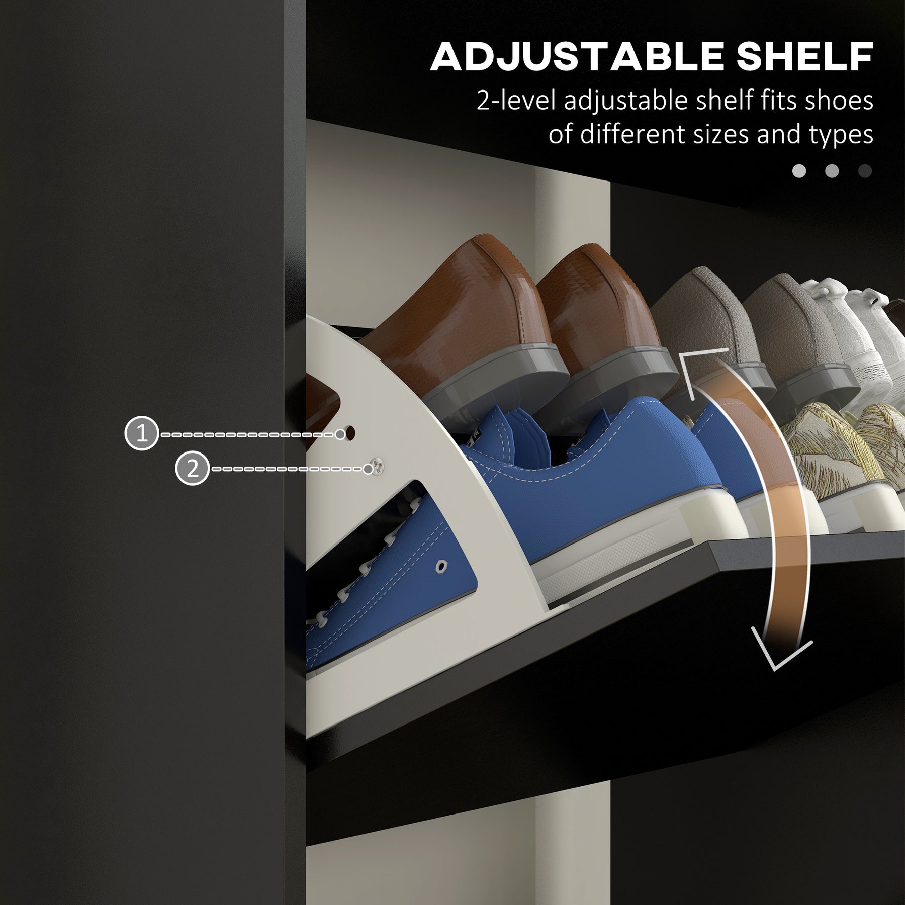 - • Three flip drawers store shoes neatly, adjustable for various sizes