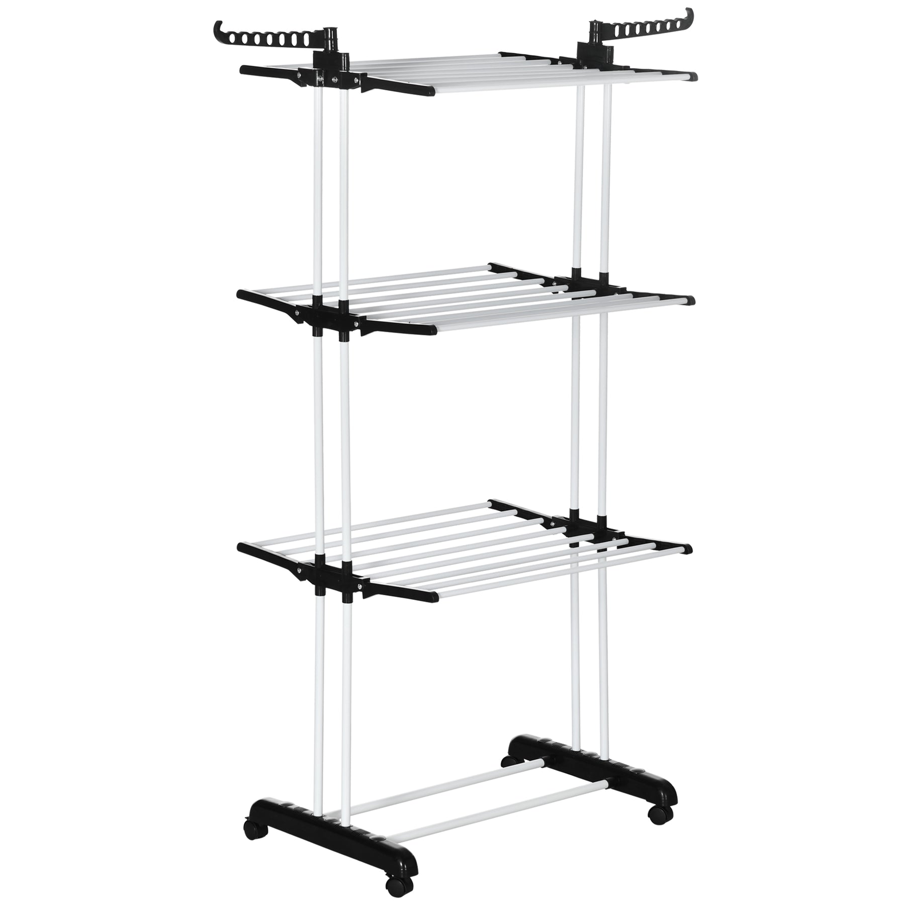- • 3-tier rack with two swivel side wings (14 hooks) provides a large drying area for coats, socks, and a bottom shelf for shoes