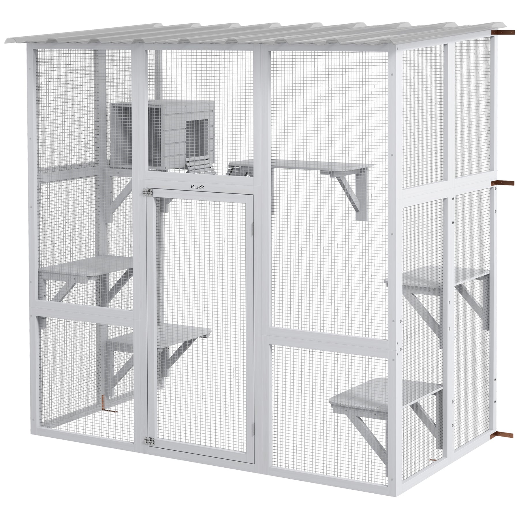 Welcome to your cat's new favorite spot - a spacious outdoor catio! This cat patio from PawHut is an outdoor cat shelter with a solid wooden structure. Your furry friend will love lounging on the different platforms and napping in the cozy cat box. Plus, you can feel good knowing your cat is safe and secure in their cat cage. Upgrade your cat's outdoor experience with this stylish and functional cat enclosure today!