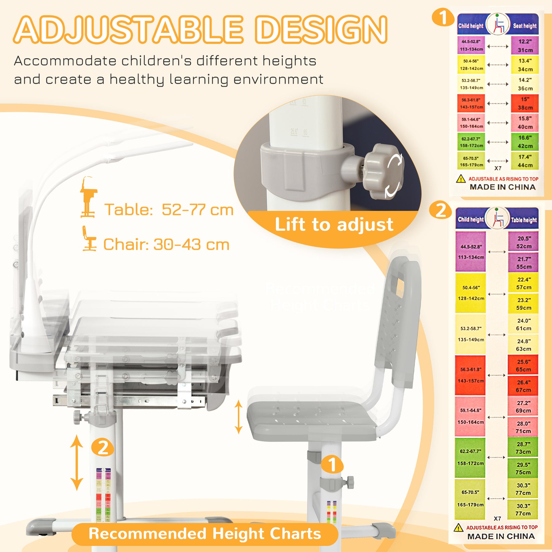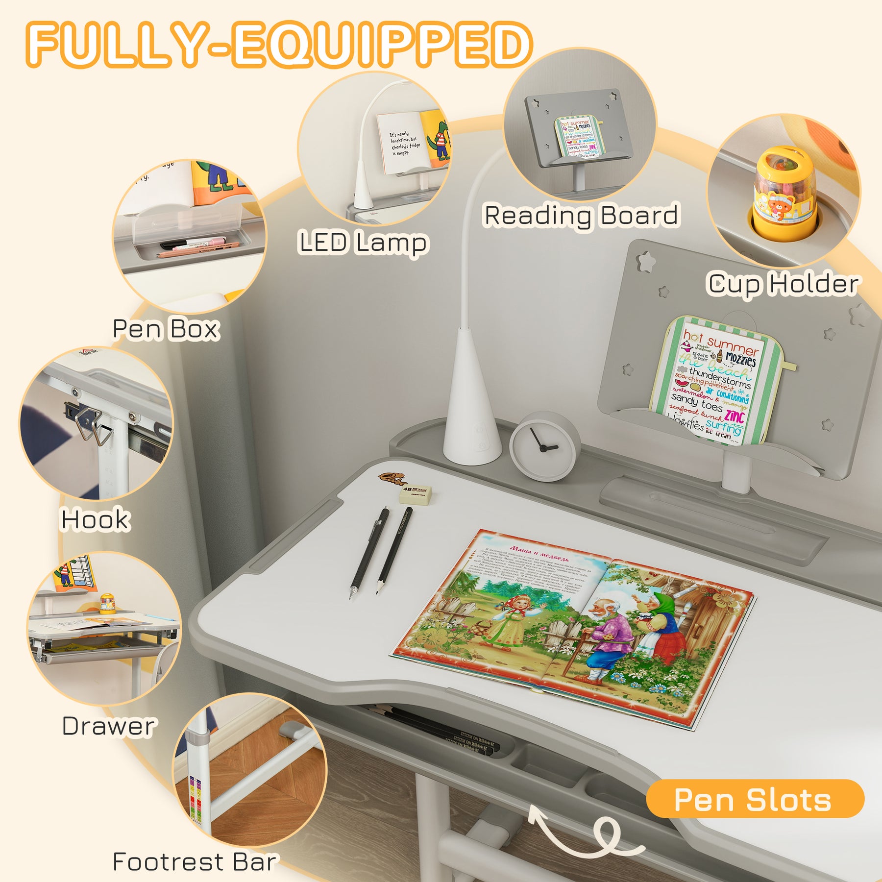 Want to establish a solid foundation for your children's fun and learning? The Qaba kids' table and chair set provides a stable workspace. With adjustable height and a 45° tilt function, it promotes healthy posture. The desk includes a pencil case, cup holder, and storage drawer for organization. A USB-powered LED lamp with adjustable colour temperatures and a book holder reduce eye strain. Create a space that fosters endless creativity for your little ones.