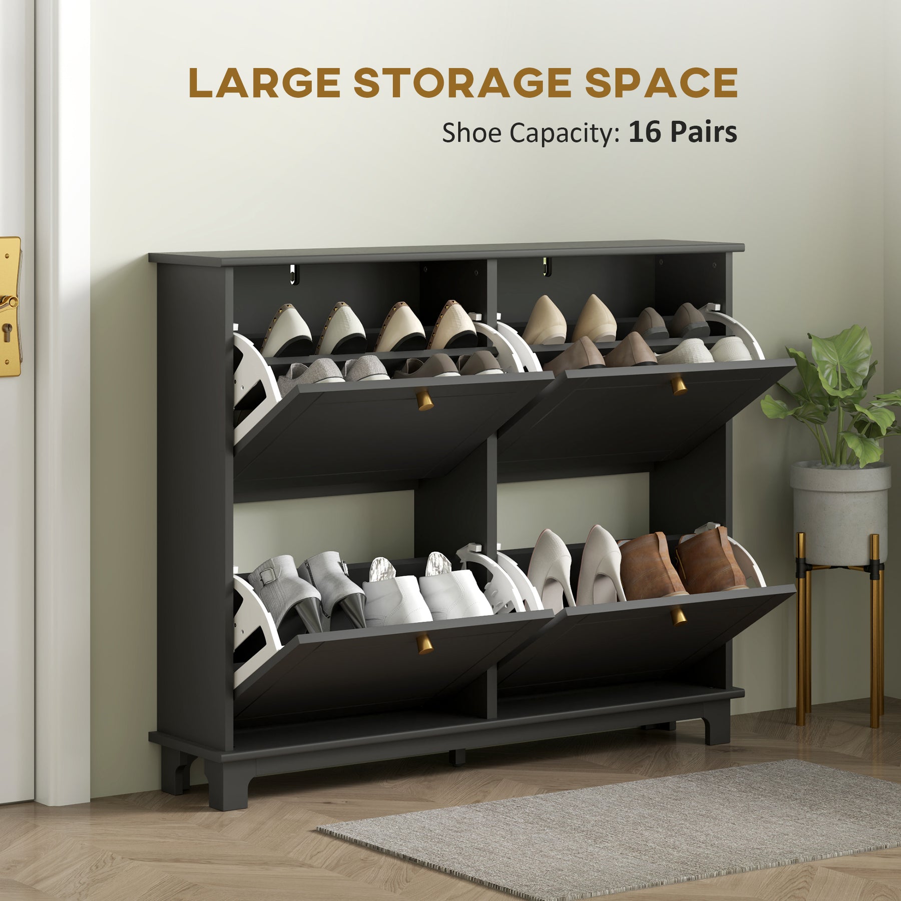 Step into style and organization with the shoe cabinet from HOMCOM. Its sleek finish, carved lines, and chic gold handles add a modern twist to any entryway. This hidden shoe storage cabinet features four flip drawers that neatly store up to 16 pairs of shoes, with adjustable shelves for added convenience. Suitable for tight spaces, this entryway shoe storage cabinet combines elegance with functionality.