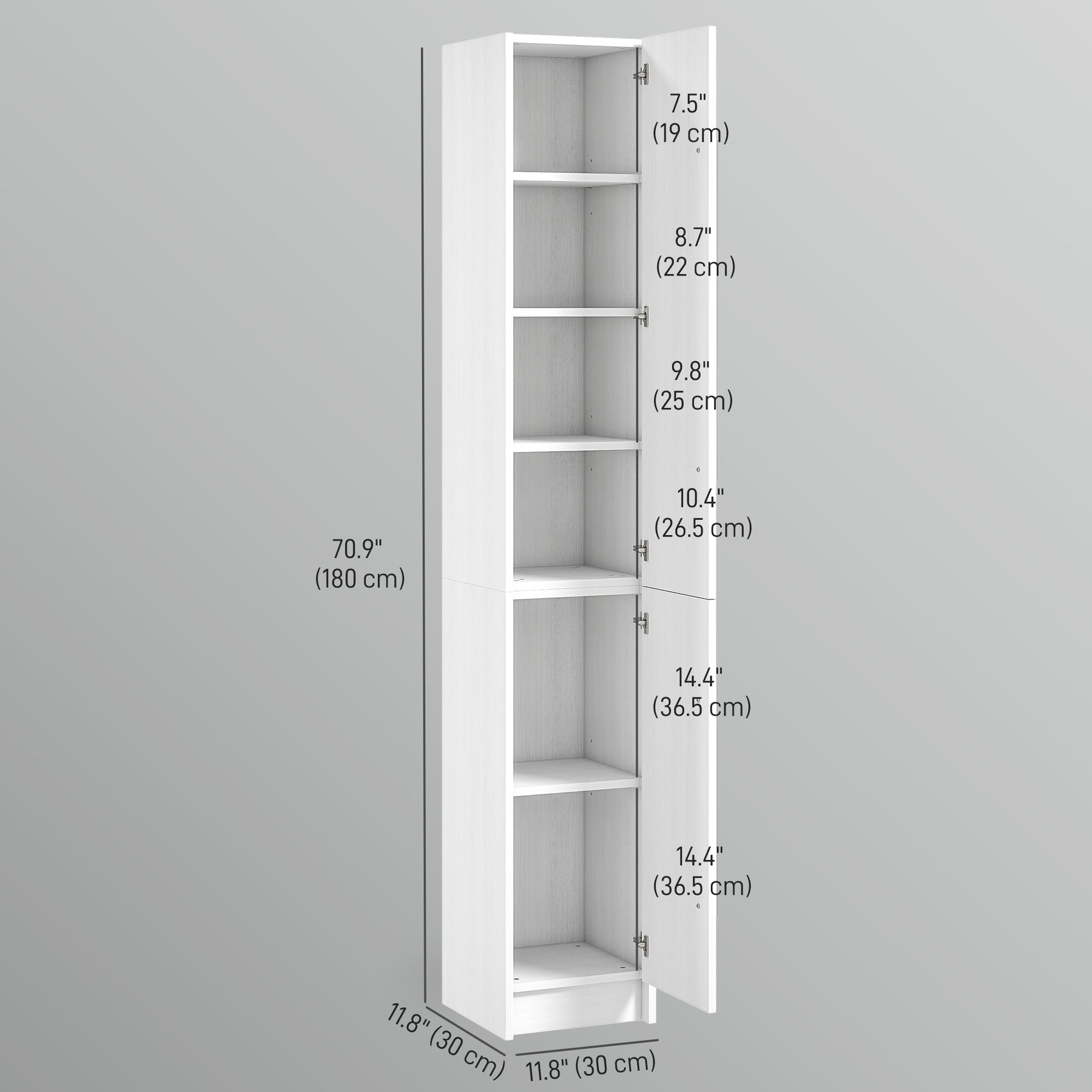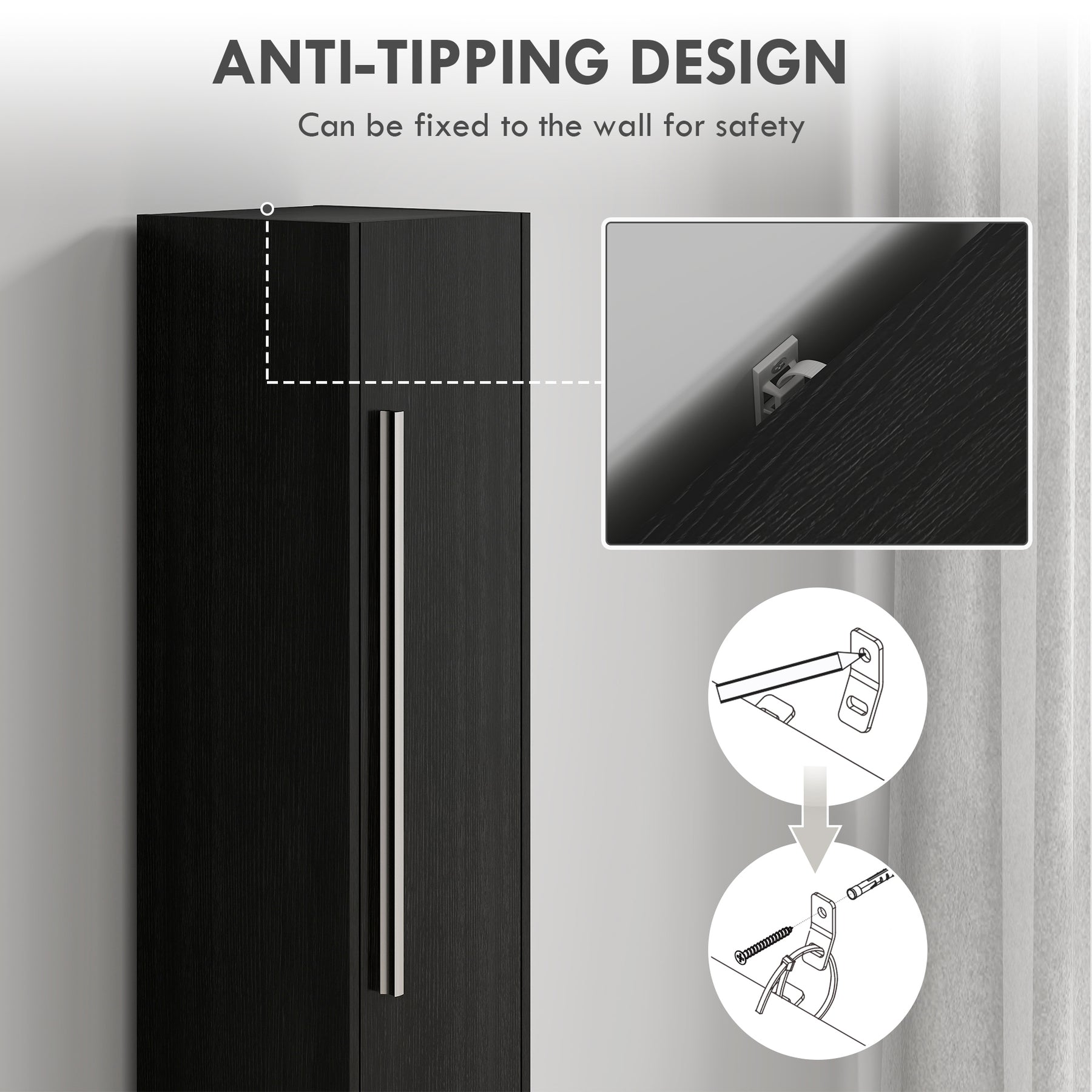 Maximize your space with the sleek HOMCOM bathroom cabinet! This tall and slim storage cabinet fits seamlessly into small areas, offering ample storage with 4-tier top and 2-tier bottom cabinets and adjustable shelves. The chic black wood grain and silver handle add a modern touch to any bathroom setup. Suitable for keeping your essentials organized and within reach!