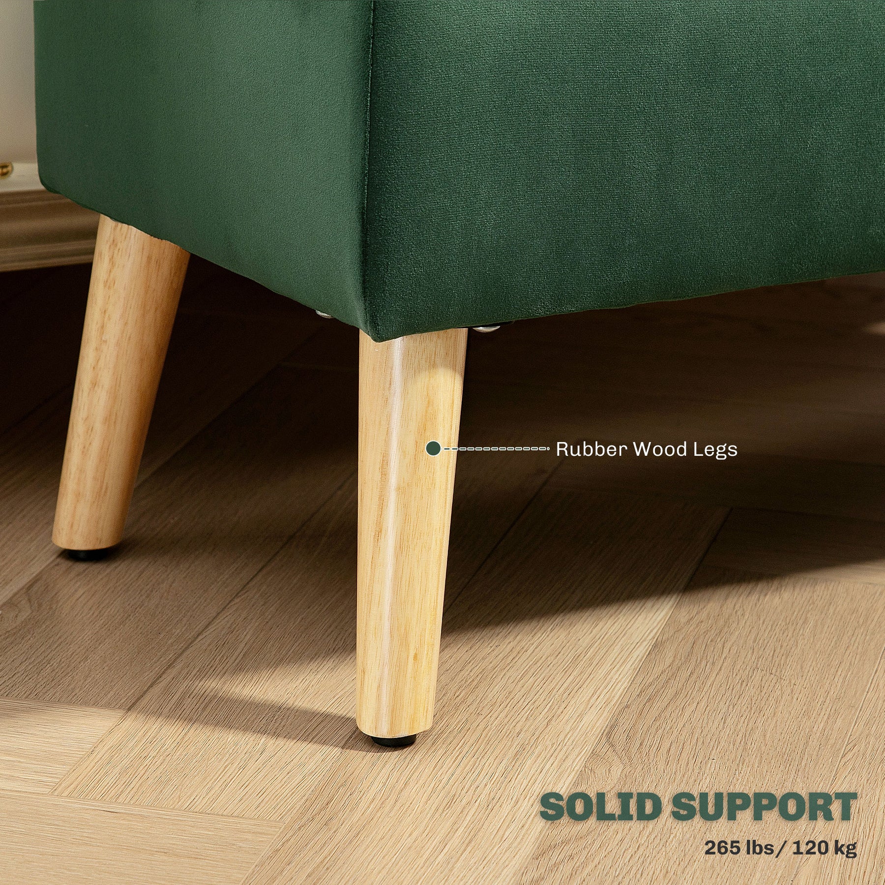 - • Strong rubber wood legs support up to 265 lbs