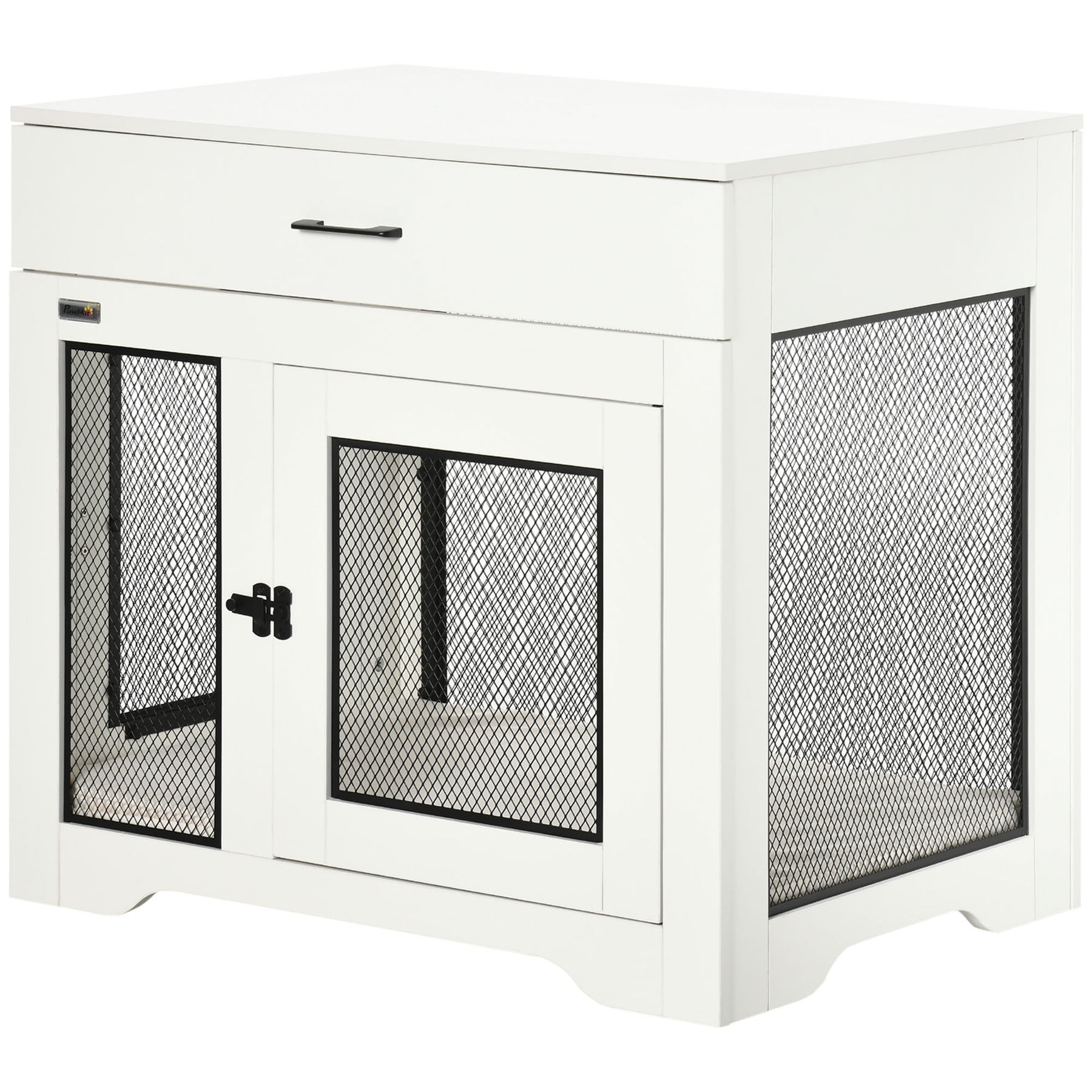 This decorative dog crate furniture contains the sleepy comfort of a pillowy surface, featuring a soft foam and a removable cover that's washable for easy cleaning. The two doors allow easy entry, and an end table design makes this dog furniture a useful home piece that both you and your pup can enjoy. The structural integrity you need for a lifetime will retain its durability and strength throughout everyday wear and tear when you make this PawHut design a part of your home.