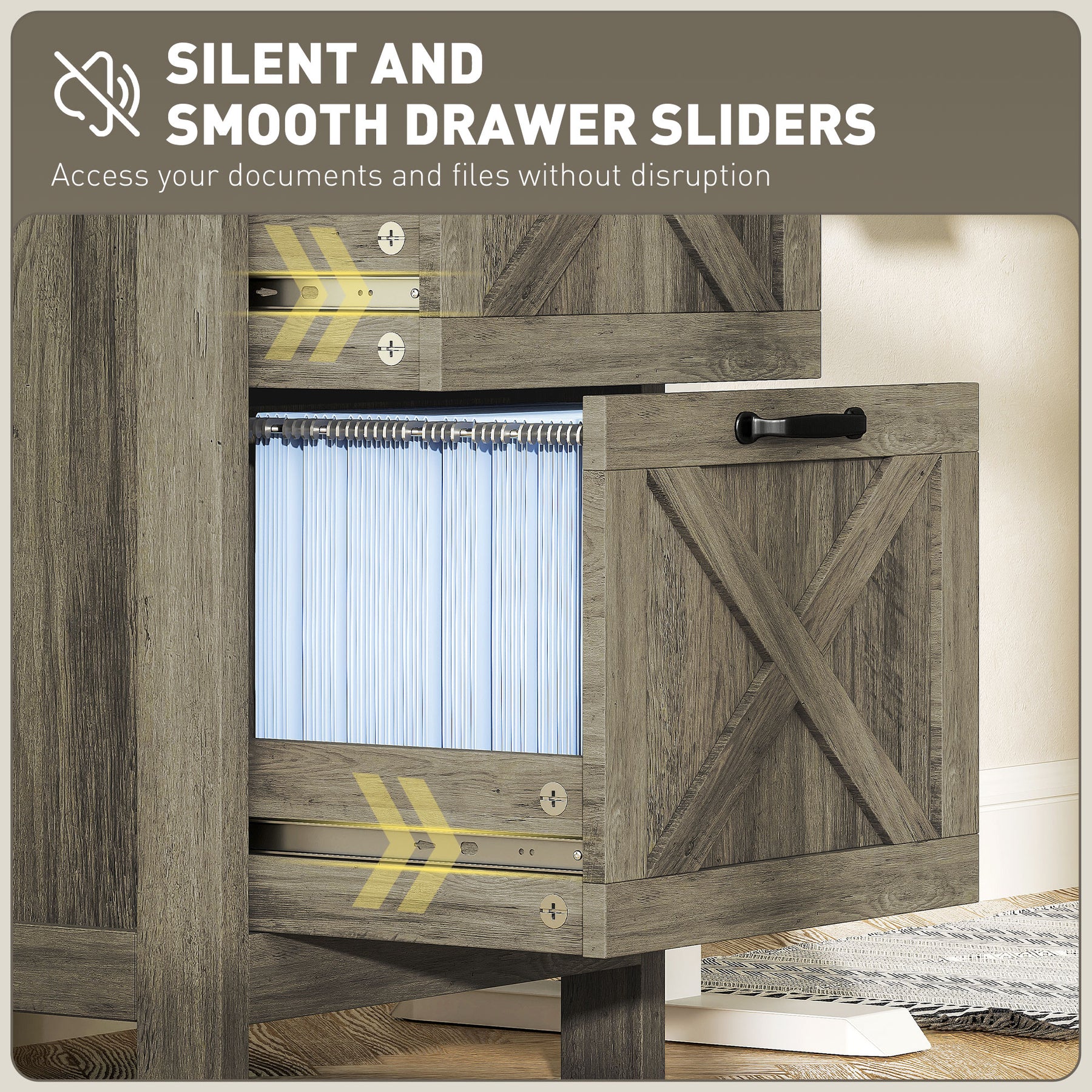 Imbue your home office with this rustic farmhouse file cabinet from HOMCOM, blending style and practicality. The barn door design paired with distressed wood effect finish and black metal accents add an attractive touch. Two small drawers and a large file drawer offer enough storage space, and thanks to the top surface with right size, it is doubling as a printer stand. Whether you need to organize office supplies or store important documents, this filing cabinet is your great choice.