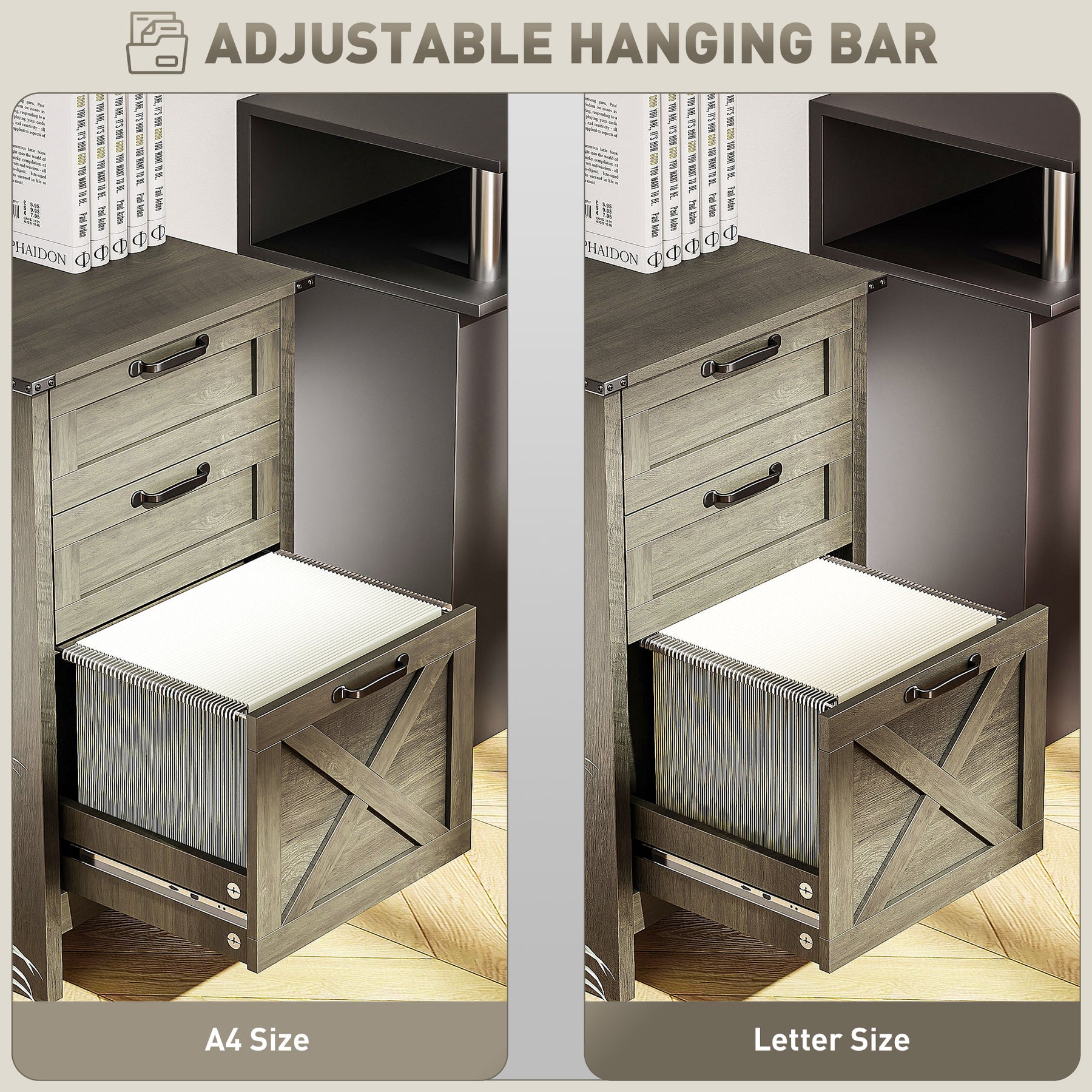 - • Adjustable bar in large drawer for A4 or letter file sizes