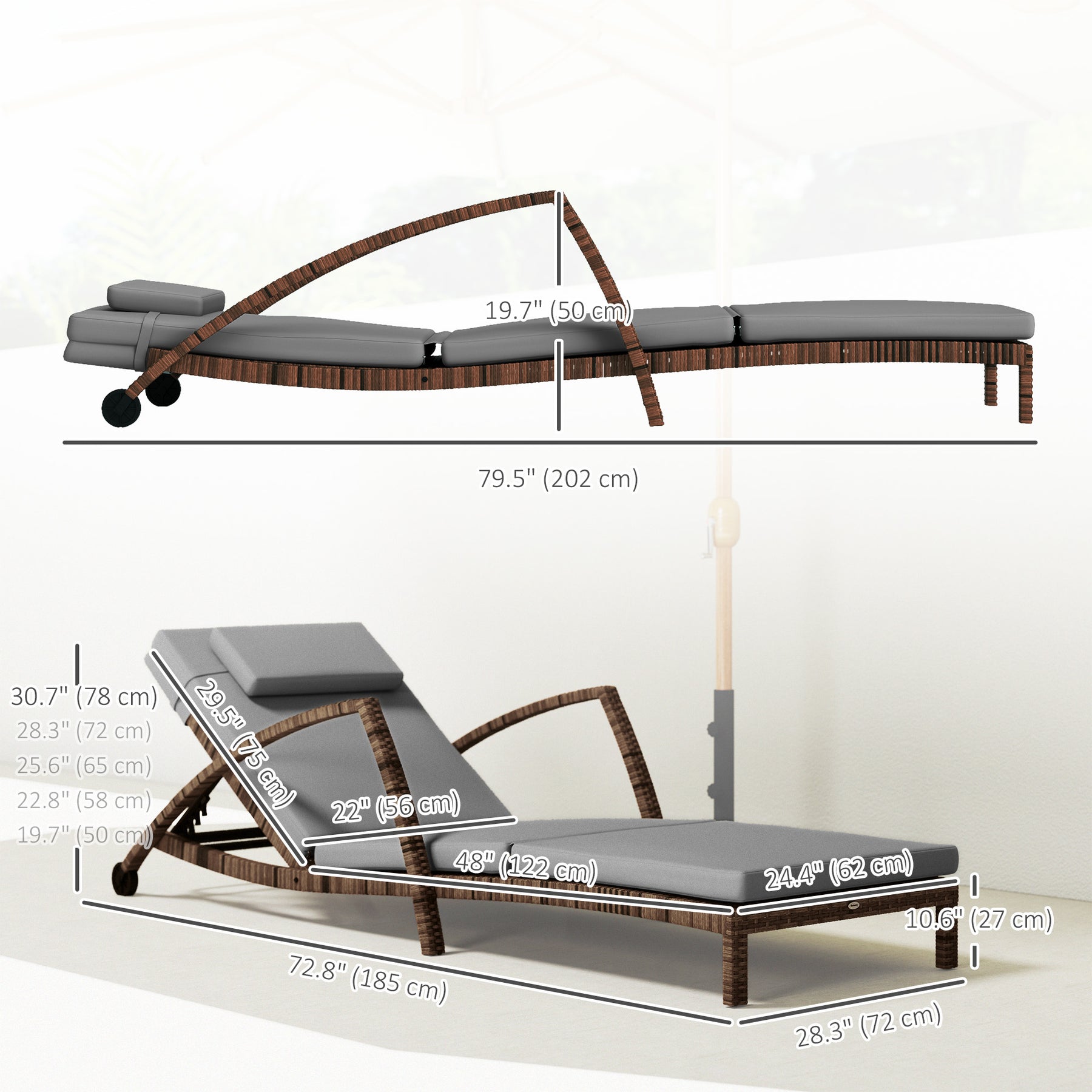 Soak up the sun in style with the Outsunny outdoor chaise lounge chair set! Each beach lounge chair features an "S" shape to match the human backline, and a five-position adjustable backrest for optimal relaxation. The integrated cushion and head pillows, all with zipper covers, enhance your comfort. This beach lounger set with wheels easily creates a cozy sunny spot in your garden, patio, or poolside. So, sit down, sunbathe, snooze, and enjoy peace and comfort with this tanning lounger set!