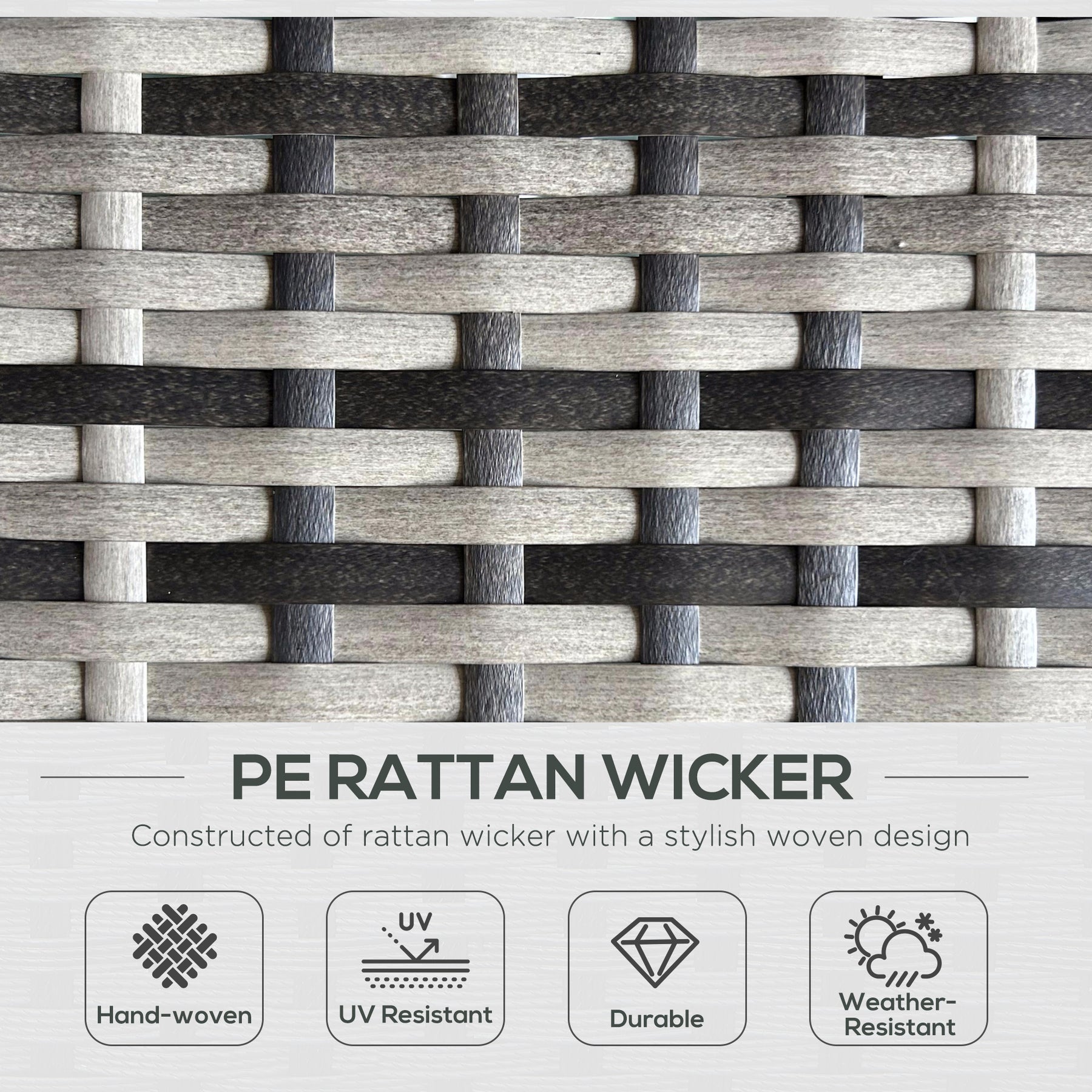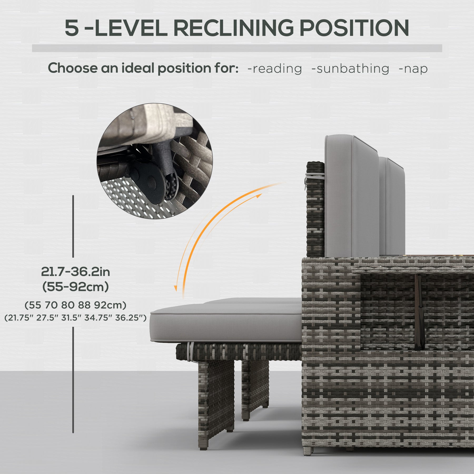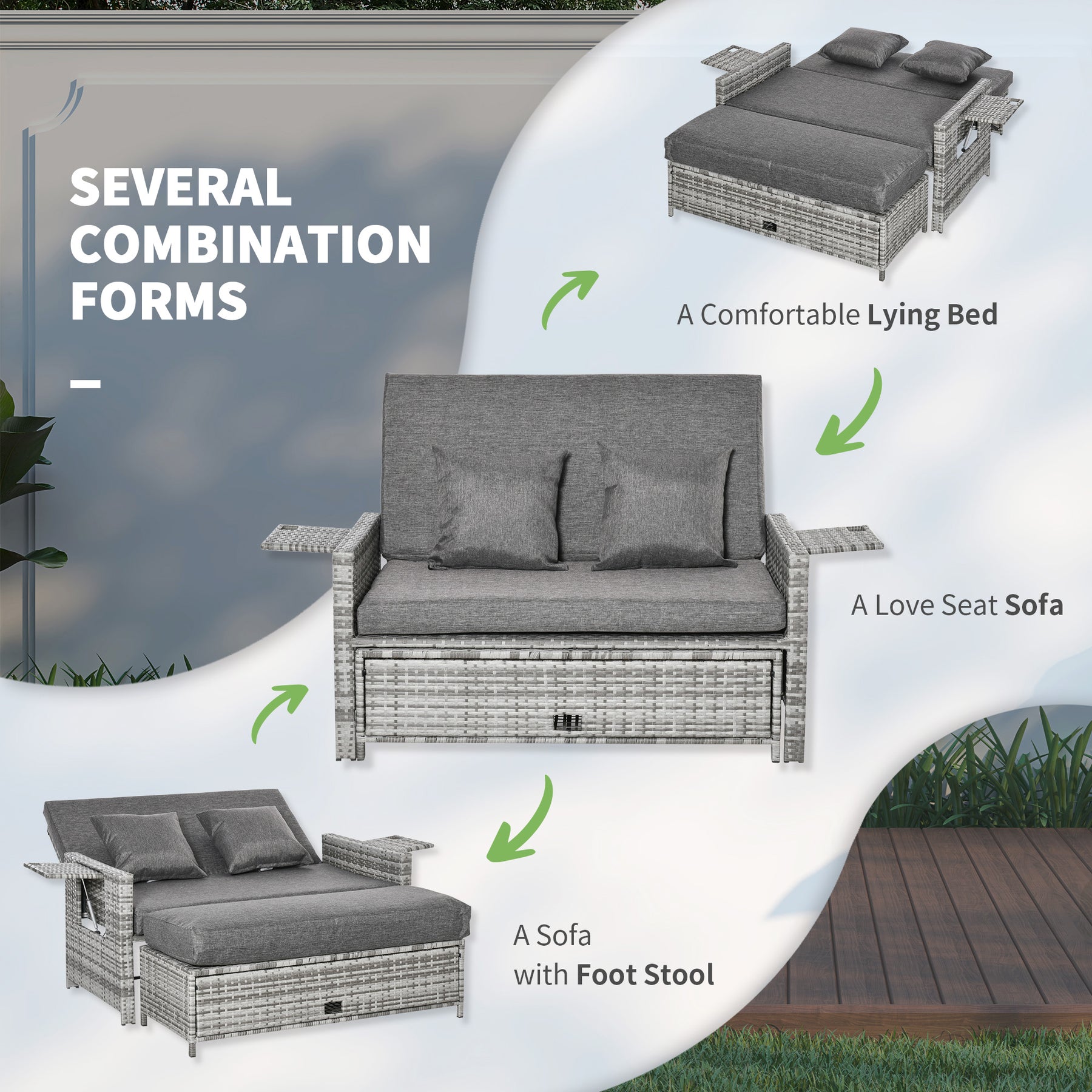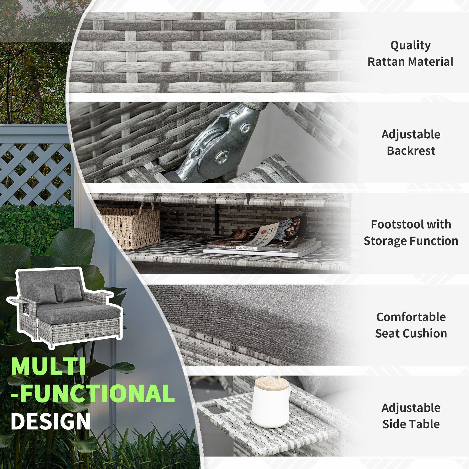 A two-piece garden day bed that can be used together or separately: lie or sit in the sun with this Outsunny patio furniture set. The back of the sofa is adjustable to different positions. The footstool has storage to keep smaller pieces in a safe place. Both pieces come with padded cushions and extra pillows for comfort. Metal frame for a strong core, wrapped in PE wicker for extra durability. Complete with hinged sides that act as a side table.