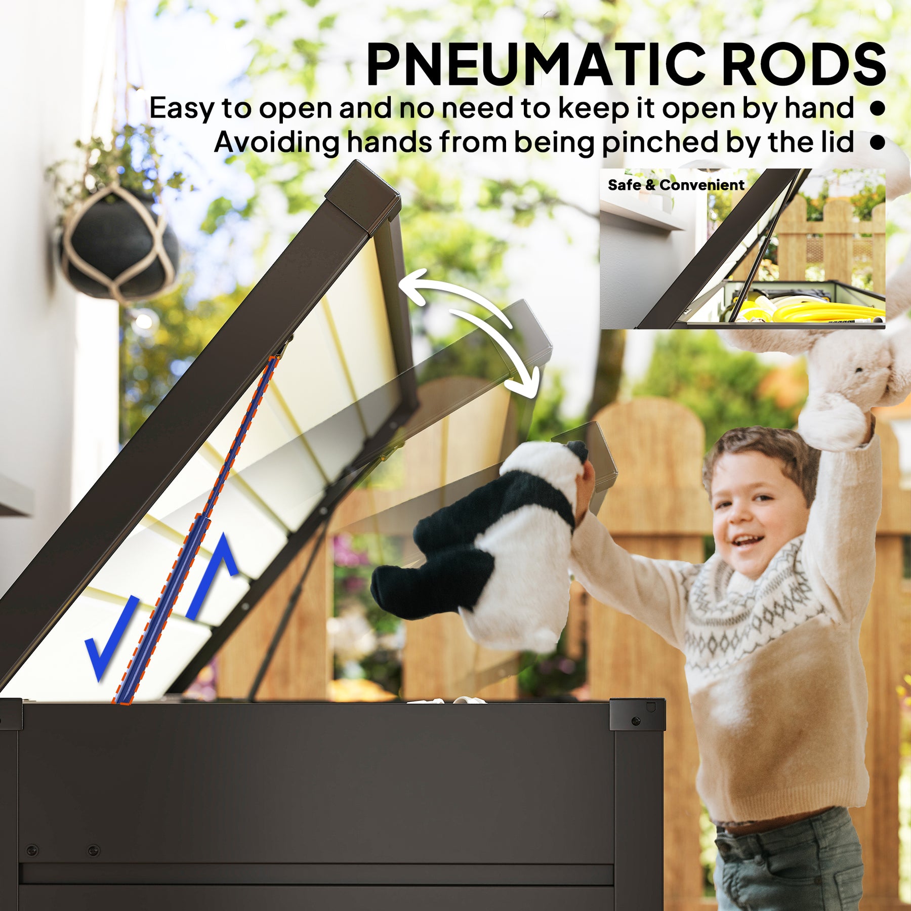 Does your garden need a storage space for garden supplies? This cushion storage box for patio from Outsunny. This deck box combines two practical uses: storage bin and bench. The enlarged lid can resist rain better, and the steel material is corrosion-resistant and can be used for a long time outdoors. For your safety, its two pneumatic rods hold the lid firmly to avoid a sudden fall. The storage bin also comes with a lock and keys for the safety of your belongings.