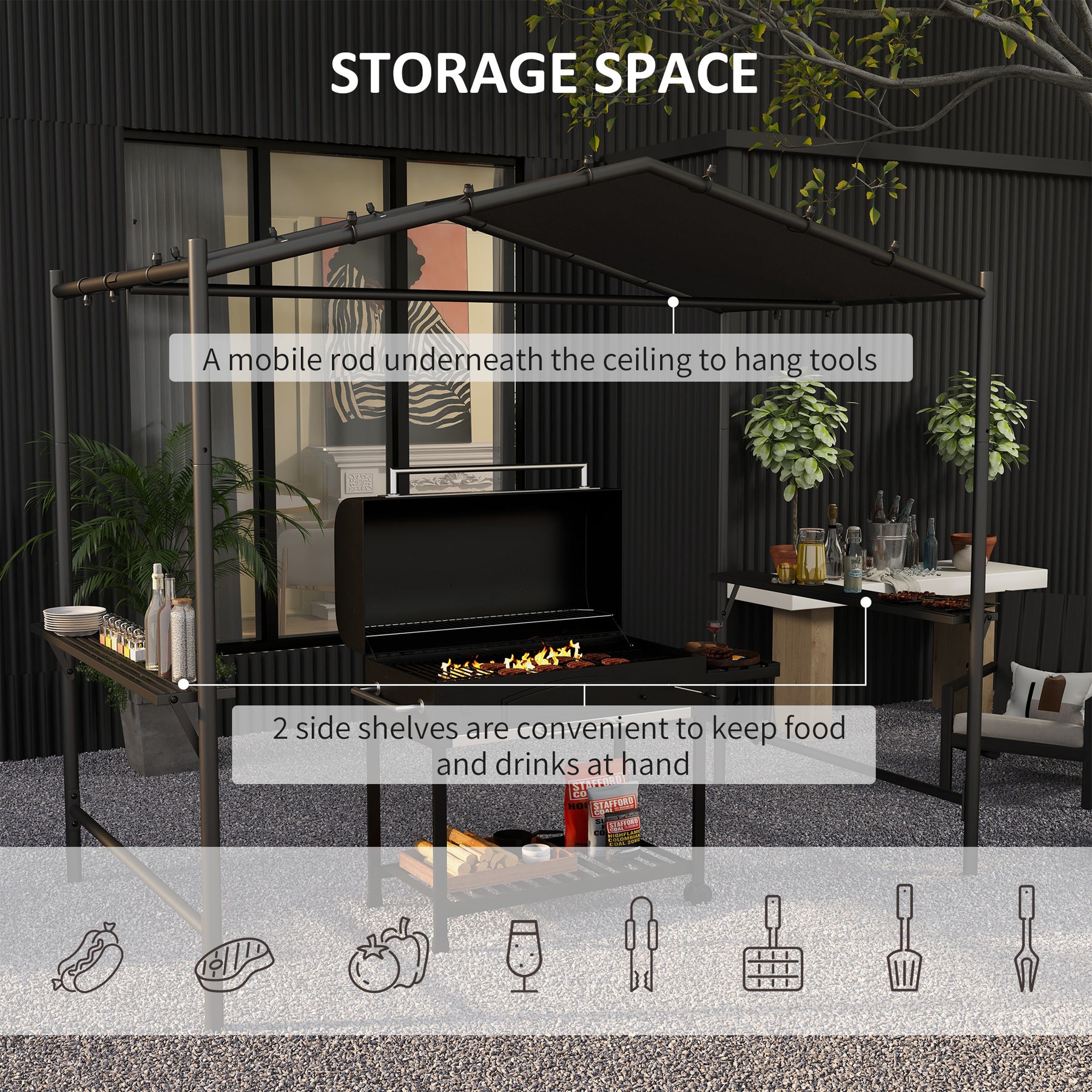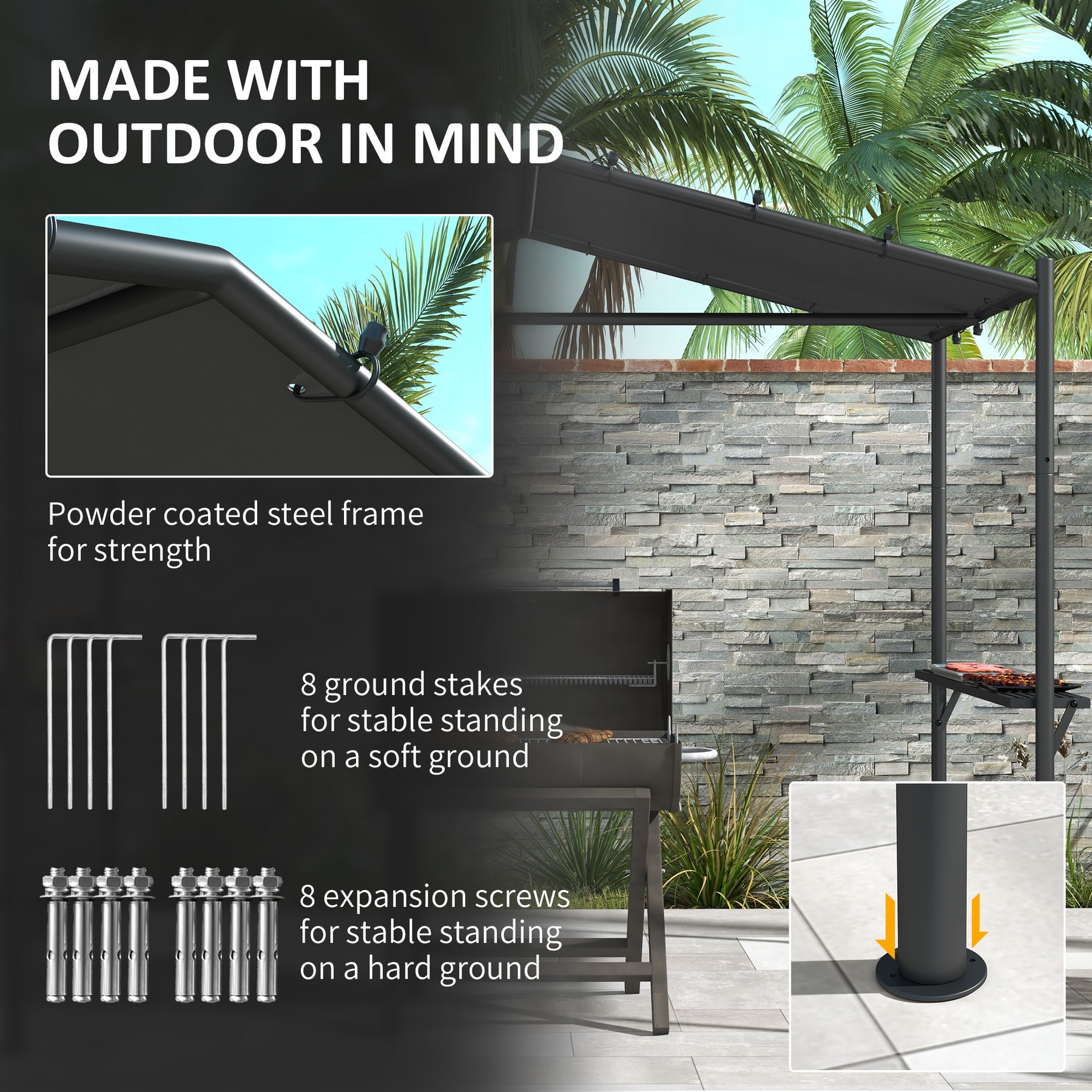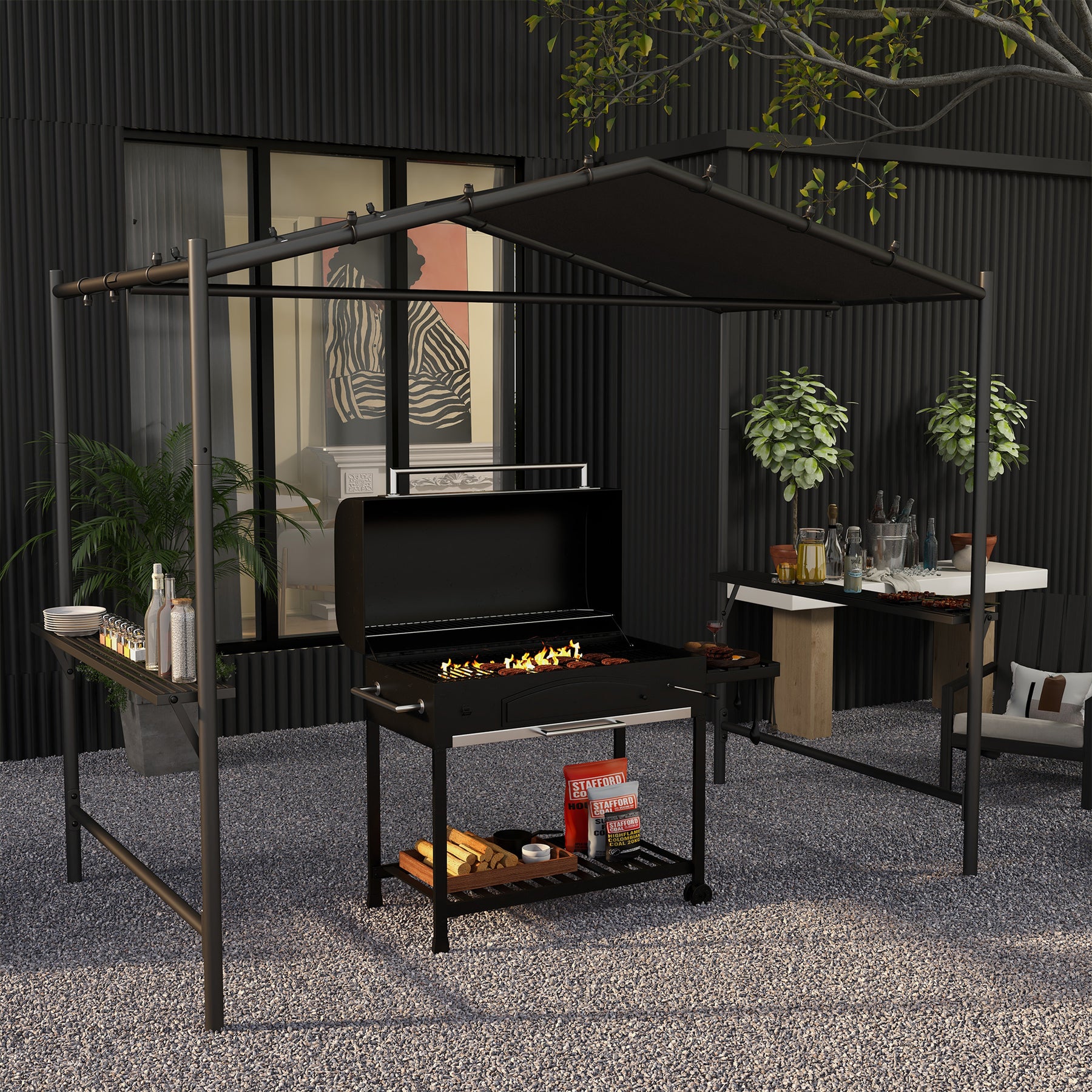 Shield your grill throughout the summer with this Outsunny bbq shelter. Comprising a solid metal frame and roof, it offers extensive workspace and a cool, shaded spot for enjoyable barbecues with loved ones. The bbq canopy includes two shelves for convenient storage of cookware and kitchen essentials. Ground stakes and expansion screws ensure stable installation.