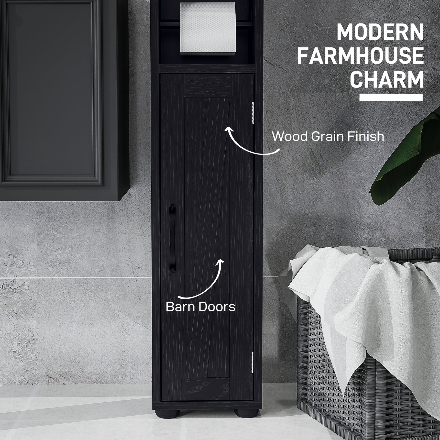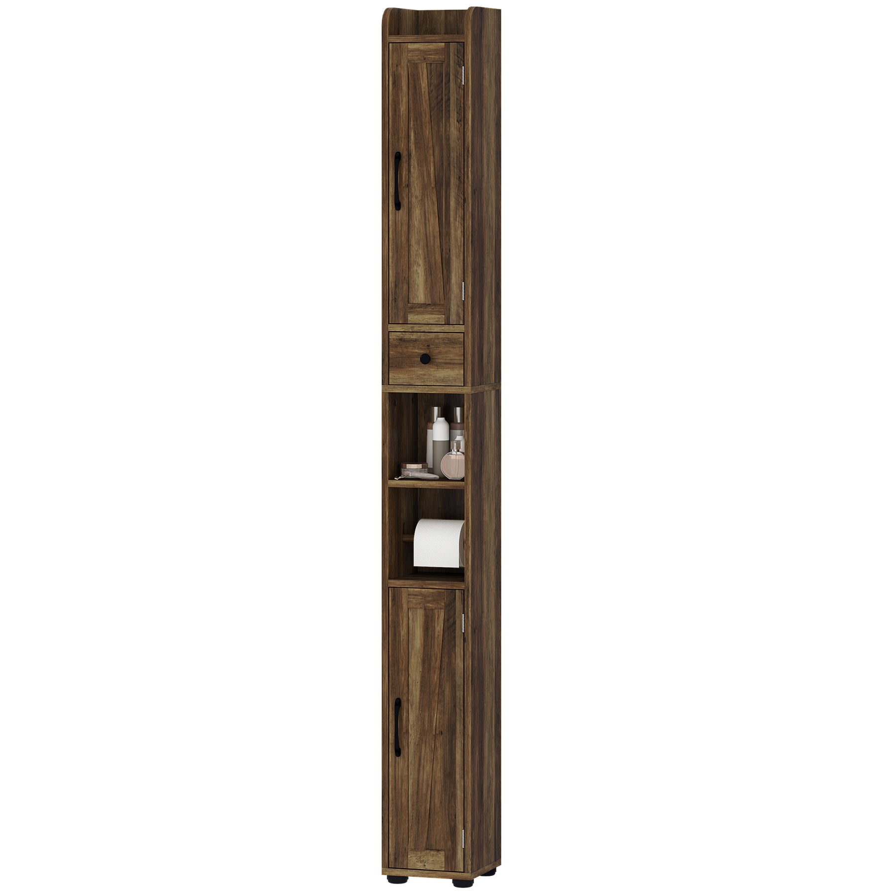 Maximize your bathroom's charm and functionality with the HOMCOM slim bathroom storage cabinet. This modern farmhouse storage cabinet with doors features three-level adjustable shelves and a space-saving design, complete with a toilet paper rod at just the right height. Enjoy organized bliss with its two-tier cabinets, drawer, and open compartments, all while keeping your style on point.