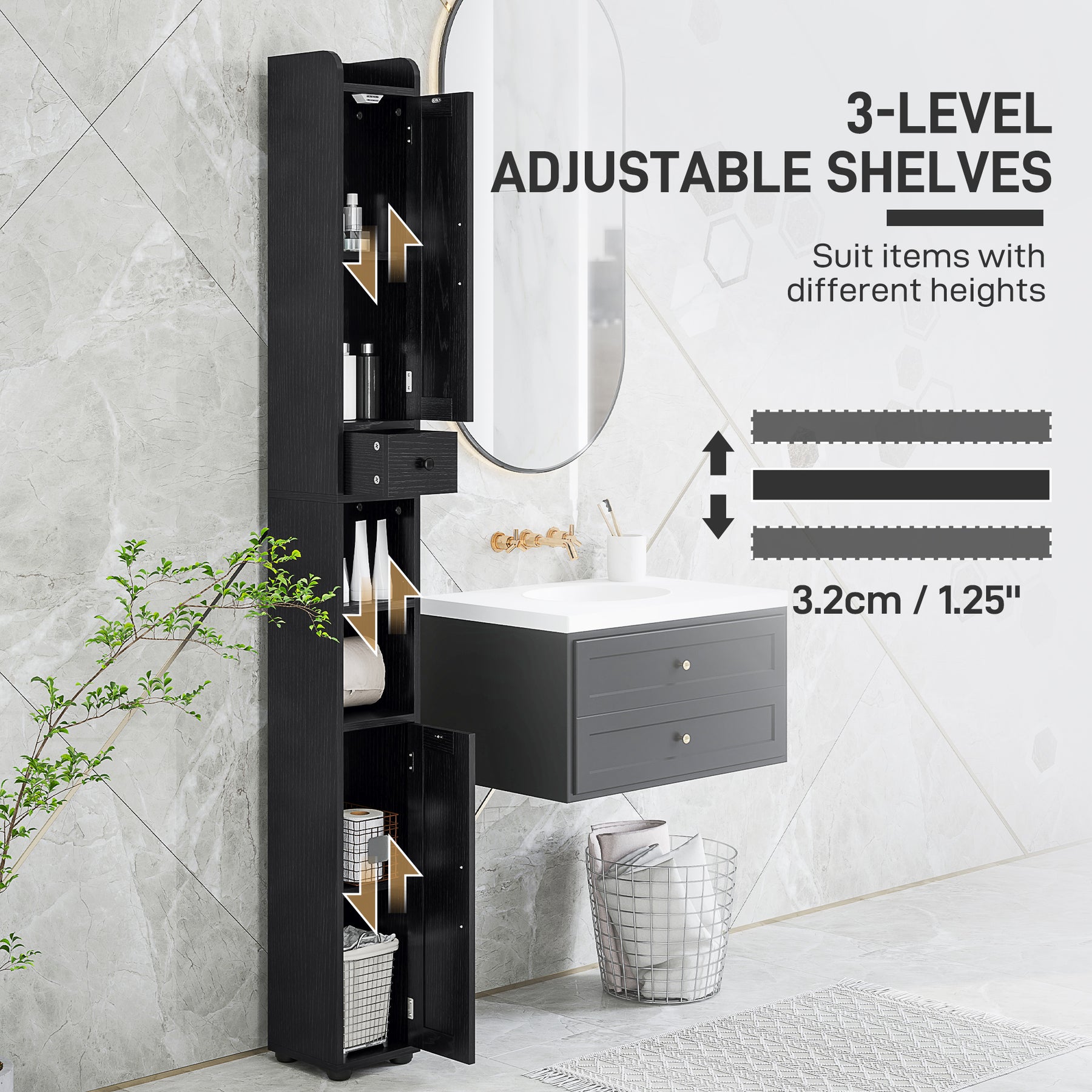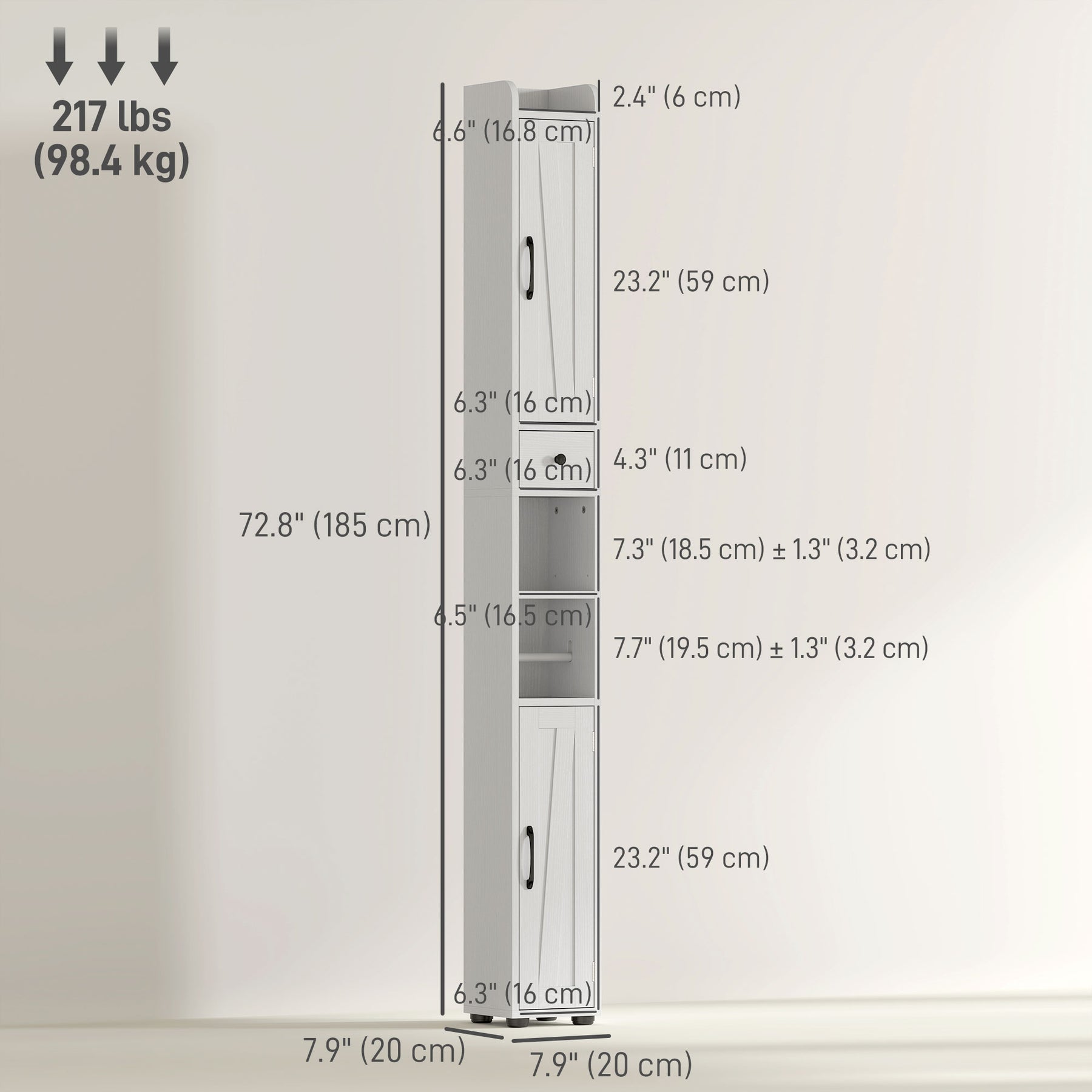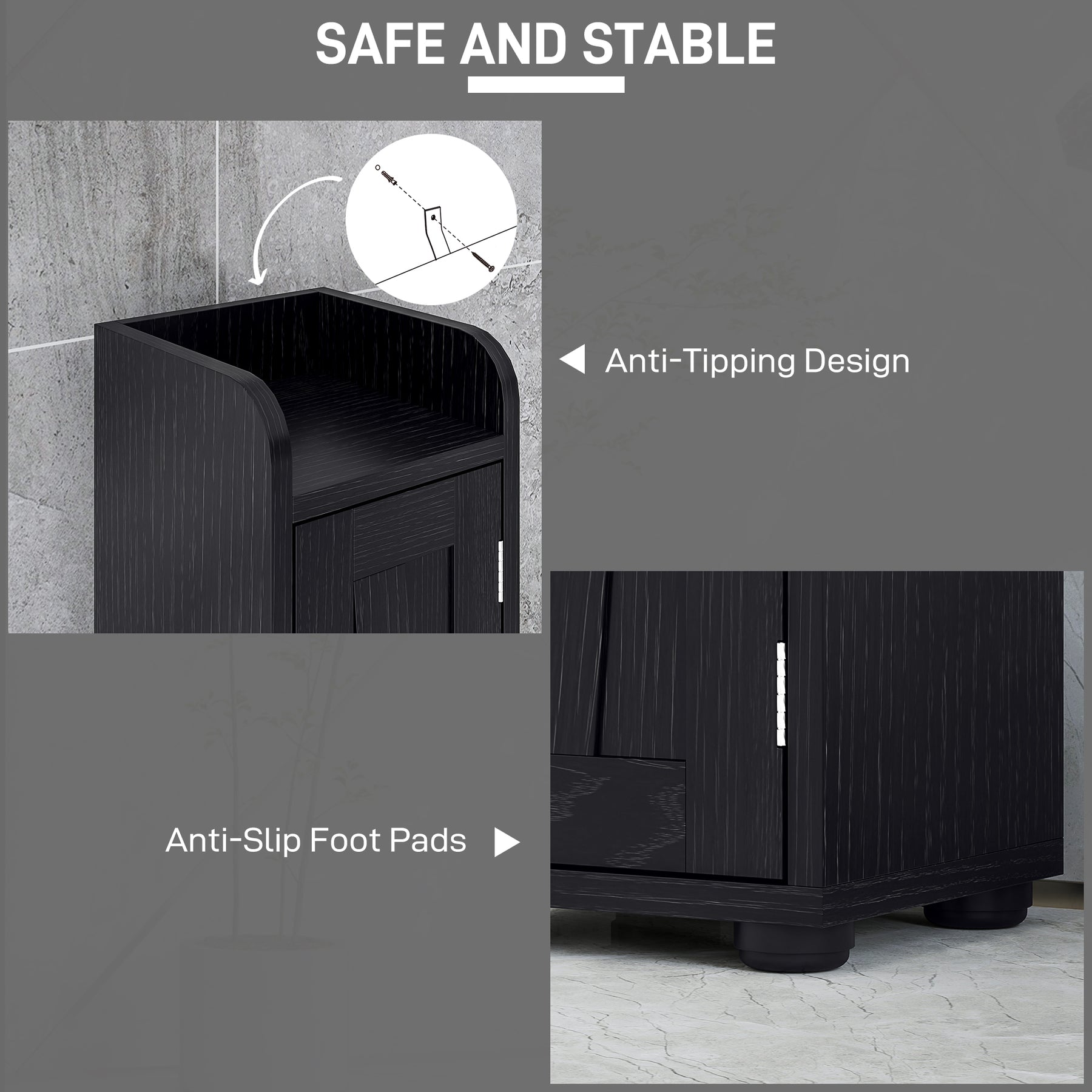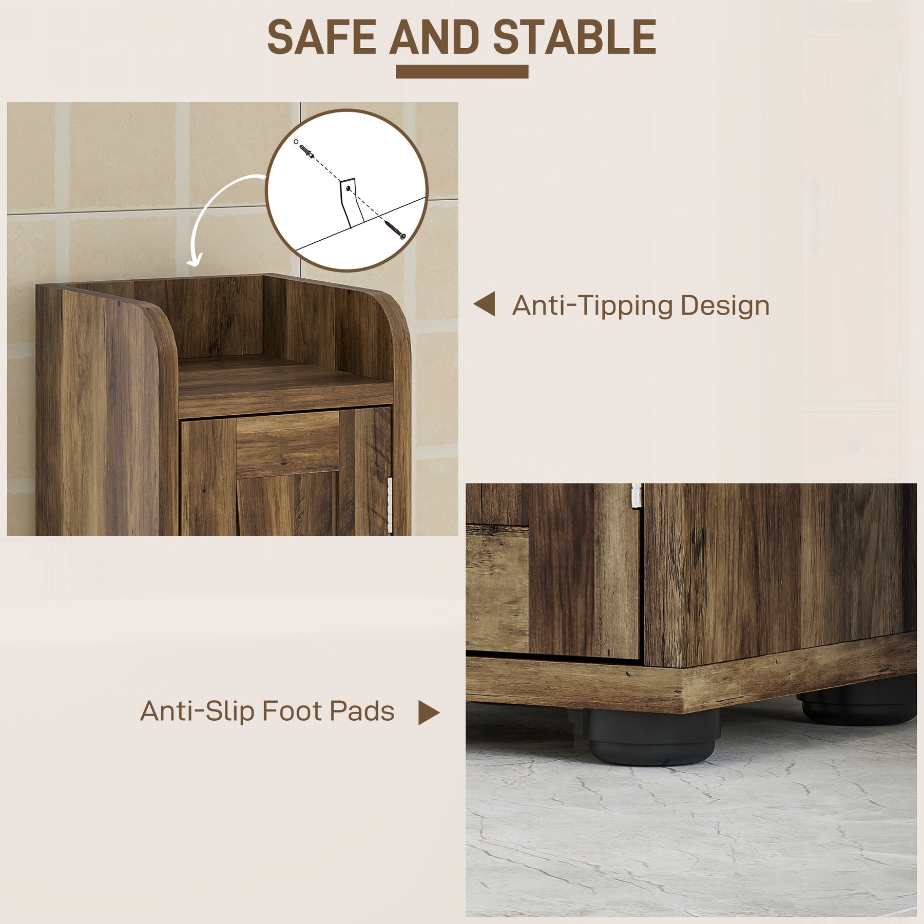 - • Raised anti-slip foot pads keep the tall cabinet stable and moisture-resistant