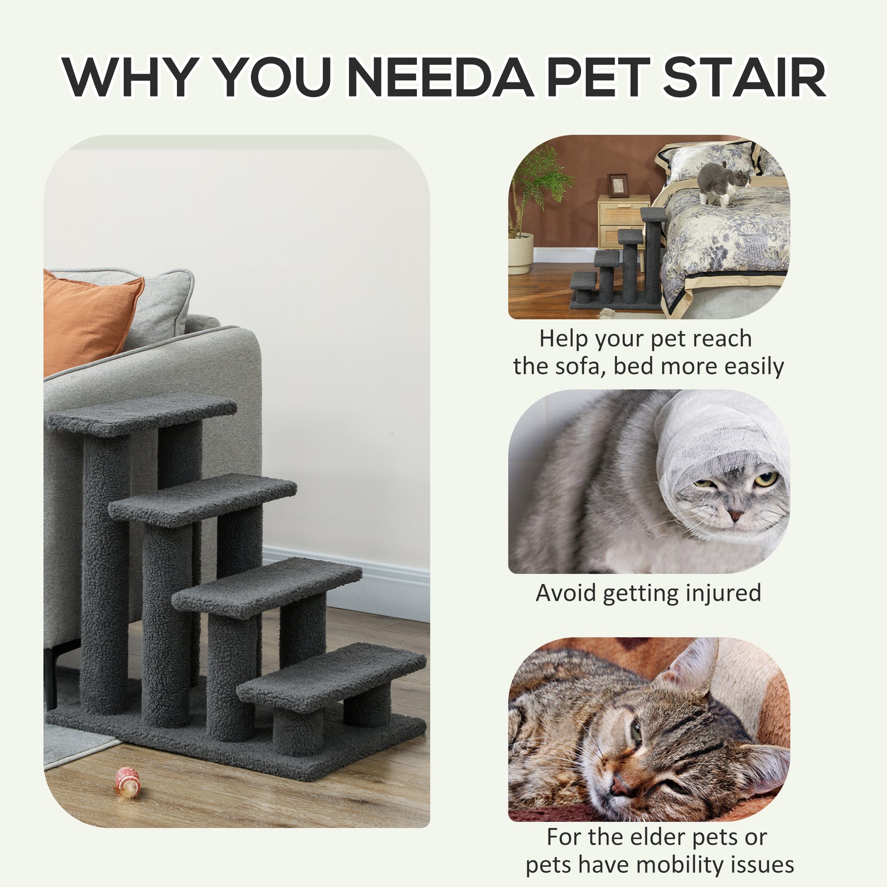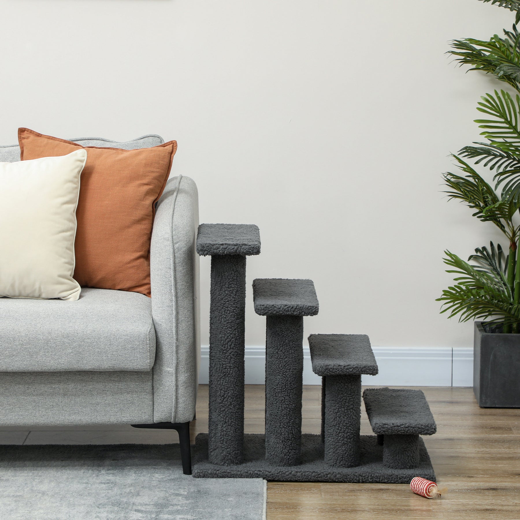Looking to help your cat and protect your furniture? The PawHut 4-Step Cat Scratching Post Bed is suitable for senior or arthritic pets, allowing easy access to their bed or favorite perch. Made from stable engineered wood, it supports pets up to 44lbs. (20 kg). Plush faux fleece steps are soft on paws yet robust for scratching, climbing, and lounging. The multilevel design with 8 posts encourages natural behaviors while keeping your furniture safe. Suitable for both play and rest!
