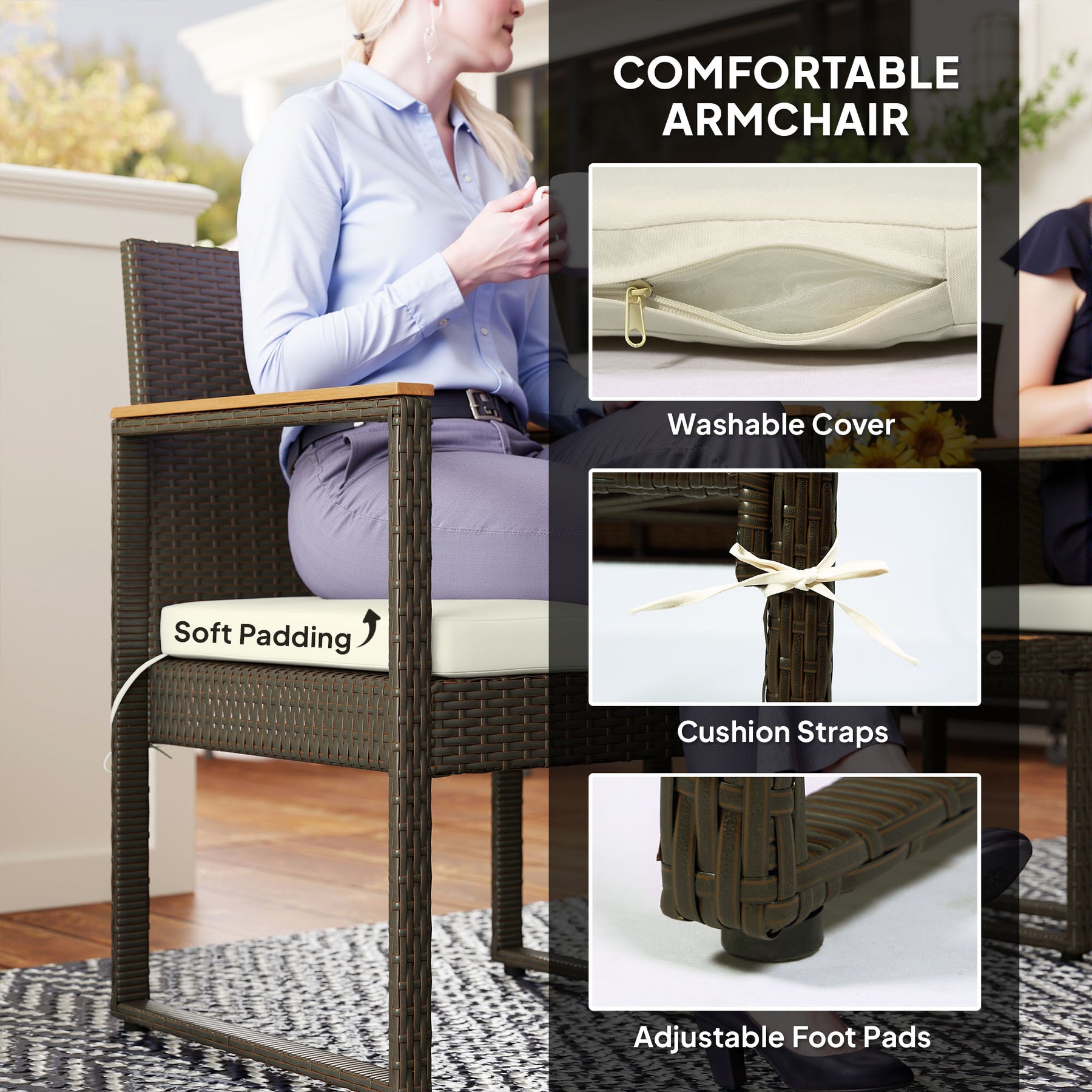 - • Materials: Steel, Acacia Wood, PE Wicker, Polyester, Foam