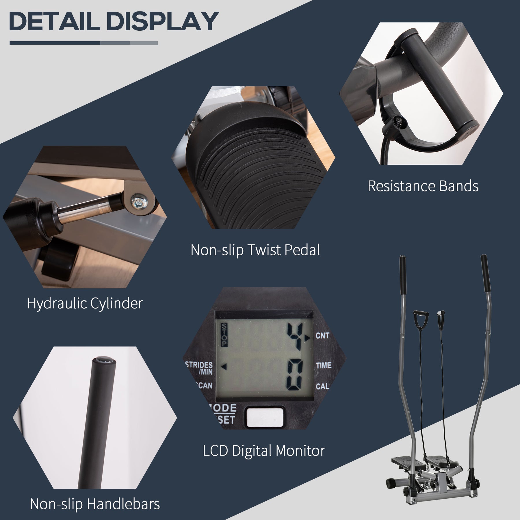 - • Two adjustable hydraulic resistance cylinders provide a smooth stepping motion
