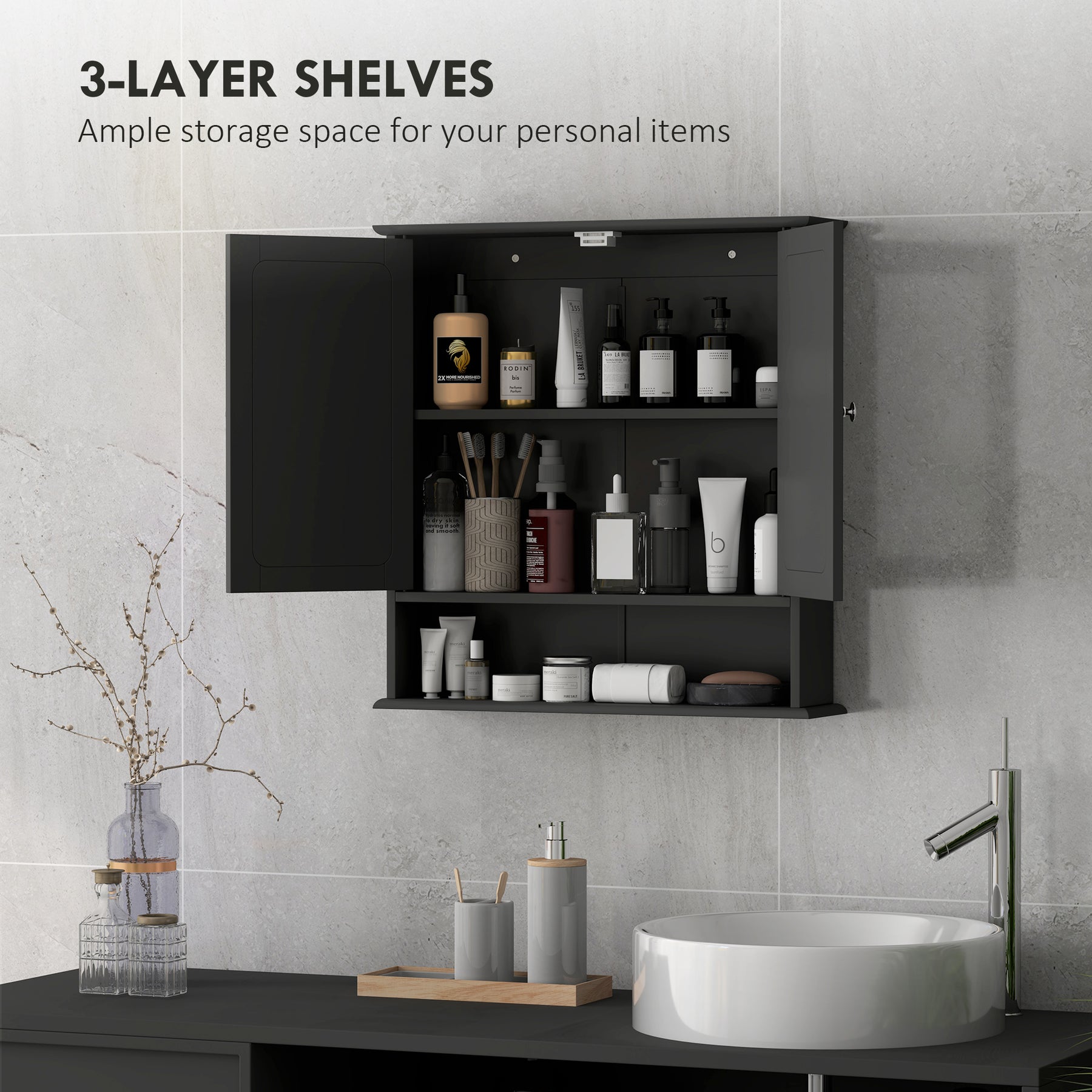 - • Two-door cabinet and bottom shelf for storing and displaying daily essentials
