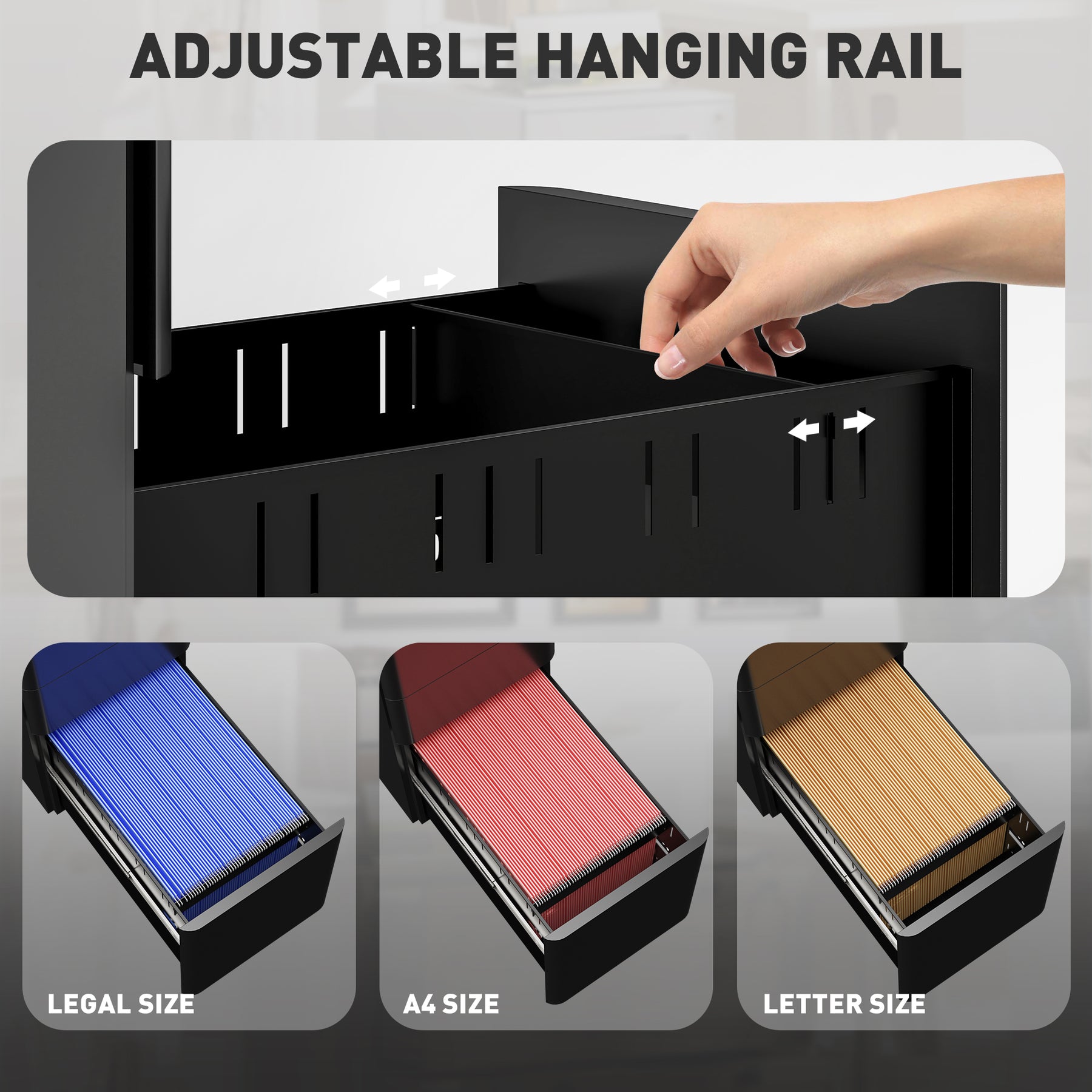 - • Large drawer with adjustable rail adjusts to fit A4, legal and letter files